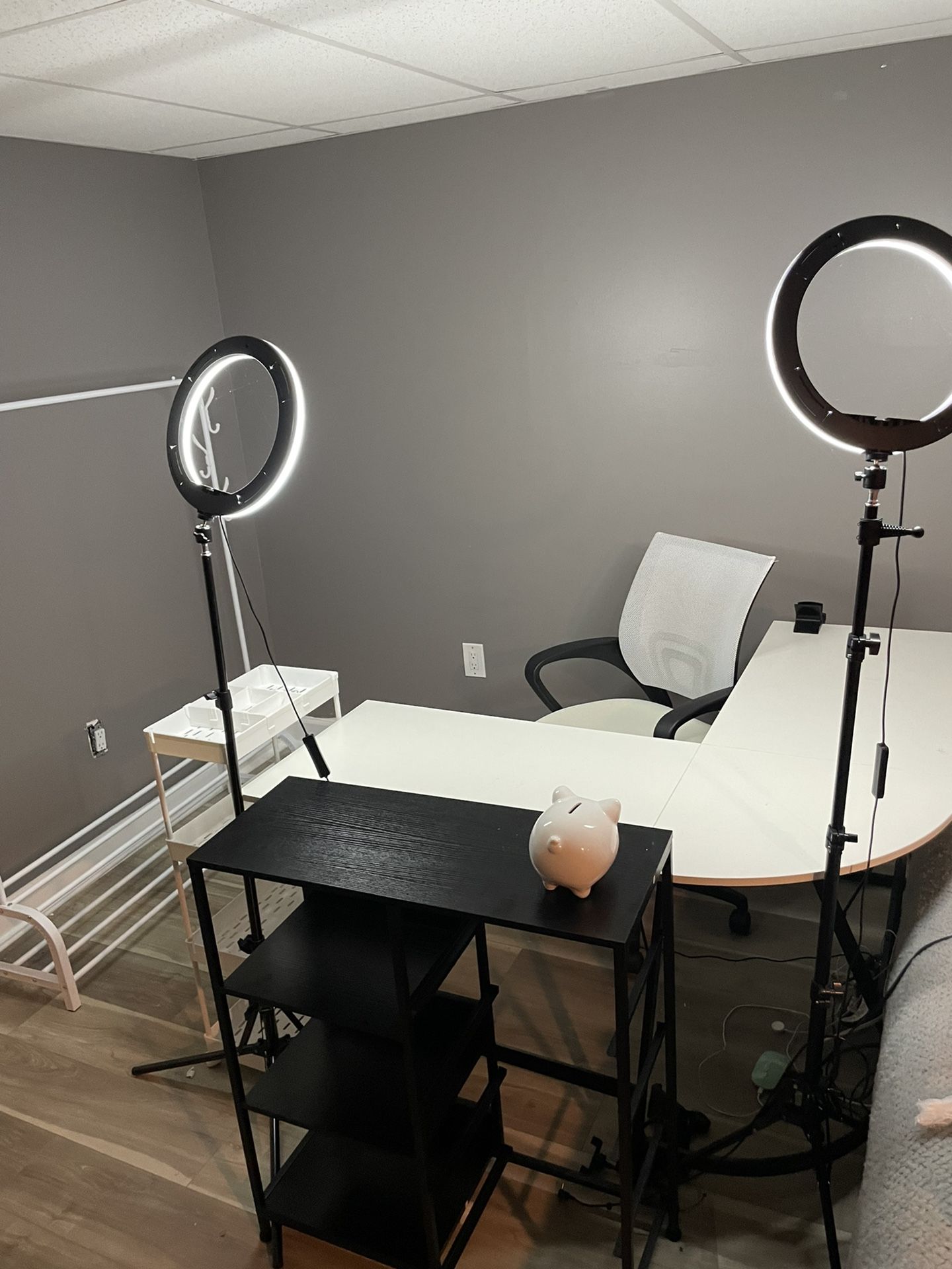All of these items have been purchased within the last 4 months the reason I’m selling them is because I’m moving, they’re all in perfect condition. You will have to come pick them up and transport them yourself I can take cash, apple pay, or zelle only Discount if bought all together:$300 Prices if bought separate: 1- small cart: $20 2-desk chair: $50 3-clothes rack: $40 4-piggy bank🐷: $10 5-storage shelves: $50 6-ring lights: $50 7:desk:150