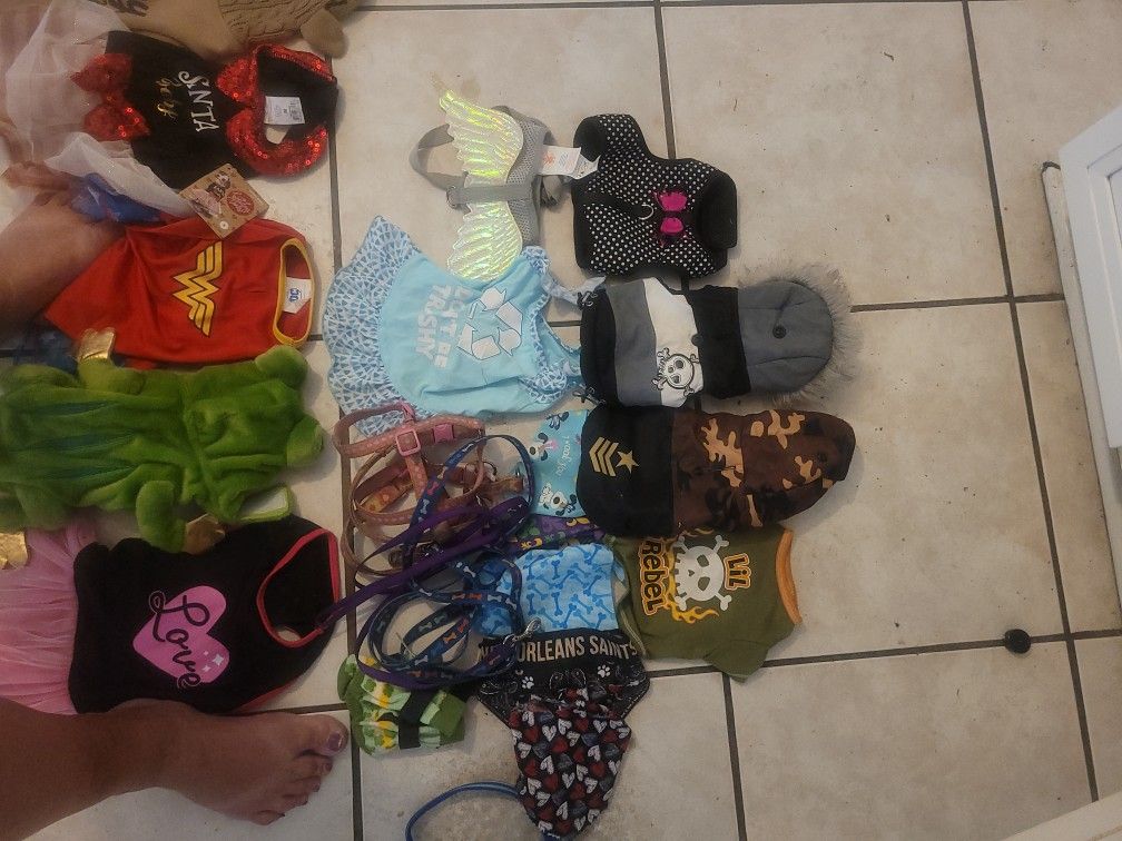 2 xxs jackets, dress, 2 harnesses and tee. Also have socks bandannas and leashes.