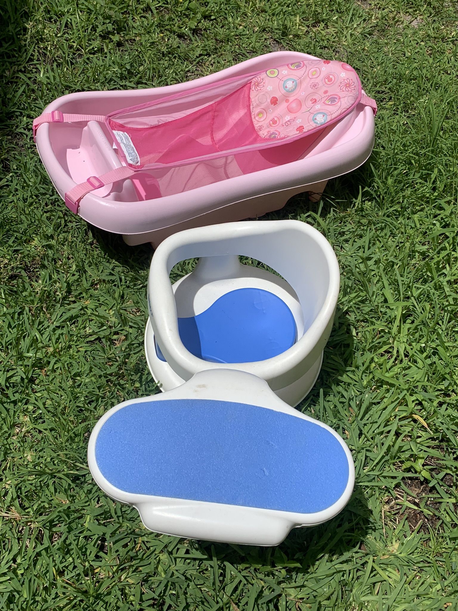 This is a set of baby bathtubs. A pink one is for newborns and has a sling to make sure that the baby stays comfortable above the water. You are able to put water in the basin below and use a soft cloth to gently wash your baby. The blue and white one is a chair that is used once the baby can sit up. Just add a small amount of warm water to the bottom of the bathtub. The arm of it swings around and is put over the lip of the bathtub to help secure it in place while you wash the baby. Obviously you should never leave a baby unattended in a bathtub regardless of assistive devices. Can meet in Maitland, Winter Park or Apopka. Asking $20 for the set, obo. Thank you for looking.