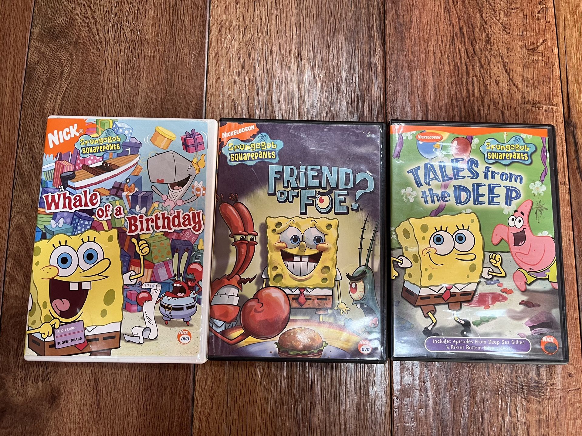 SpongeBob SquarePants dvds. Titles are “Whale of a Tale”, “Friend or Foe” and “Tales of the Deep”. The dvds are used but are excellent condition.