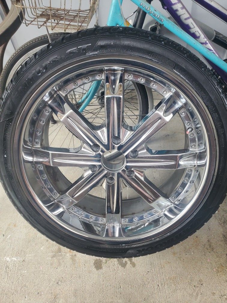 Hi am selling this set of Rims with tires 22 Will fit to any Gmc or Chevy truck or tahoe or Yukon with 6 lugs Two tires have at least 60 % life the other need to be replace as you can see on the photo.