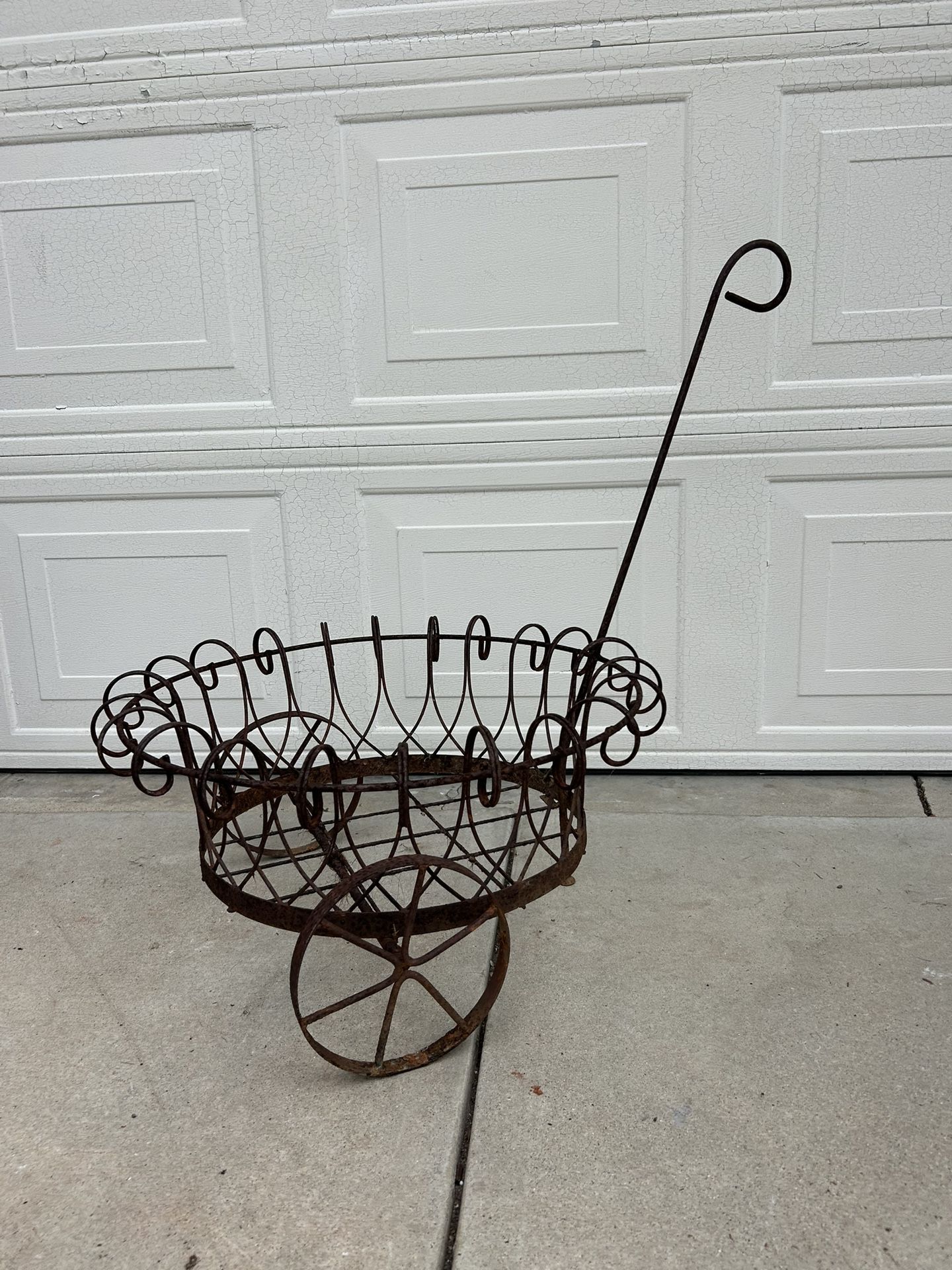 Antique scroll Wagon Garden Plant Stand Holder Display Weathered Rustic Centerpiece Wrought Iron Rare Estate Find