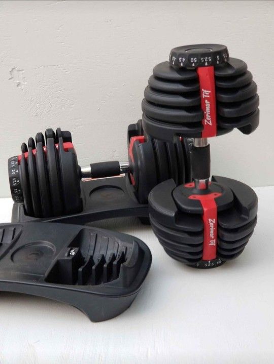 *DELIVERY AVAILABLE ONLY TO SOUTHERN CALIFORNIA FOR A SMALL FEE * - 2 brand new in box Adjustable Dumbbells - Each dumbbell adjusts from 5 to 52.5 pounds Increment chart: 5, 7. 5, 10, 12.5, 15, 17. 5, 20, 22.5, 25, 30, 35, 40, 45, 50, and 52.5 pounds! - 15 dumbbells in one! --Same mechanism as Bowflex 552