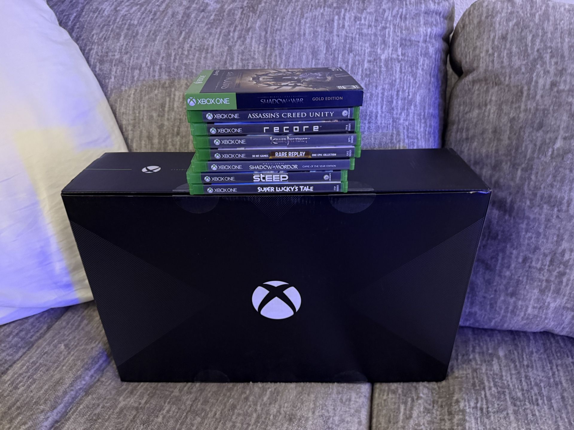 Great condition Xbox one X, comes with 8 games shown in the pictures above. Games can be sold separately if desired, but I will not sell the console without all games remaining coming with. Comes with magenta special edition controller, hdmi cable, and power cable. Cash only.