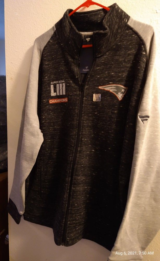 Brand New w/Fanatics tags New England Patriots Champions Sweatshirt Size; 2XL Longsleeves. Full Zipper Color; Gray/Navy Material; 18% Cotton 82% Polyester Heavy Weight Material Team Decals and Embroidered Logo FOOTBALL SEASON SALE 33$ Pick-Up in Gladstone