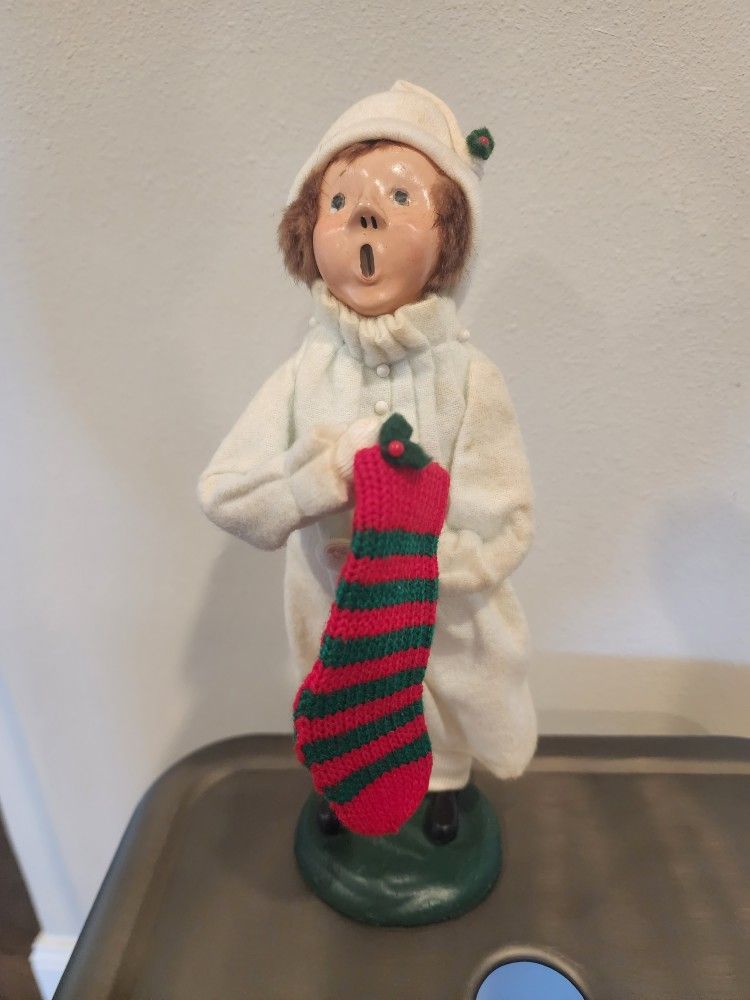 VINTAGE 1985 Byers Choice Christmas Winter Carolers Figurine Doll 10" Tall. The caroler is holding a red Christmas stocking. The white gown is slightly discolored, SEE pictures. No holes or tears in material. PLEASE LOOK AT ALL OF OF PICTURES AND ZOOM IN TO DETERMINE THE CONDITION FOR YOURSELF YOURSELF BUYING. THE PICTURES SERVE AS PART OF OF DESCRIPTION. I SHIP SAME BUSINESS DAY IF PURCHASED BEFORE 1030AM. NEXT BUSINESS DAY IF PURCHASED AFTER 1030AM EST.