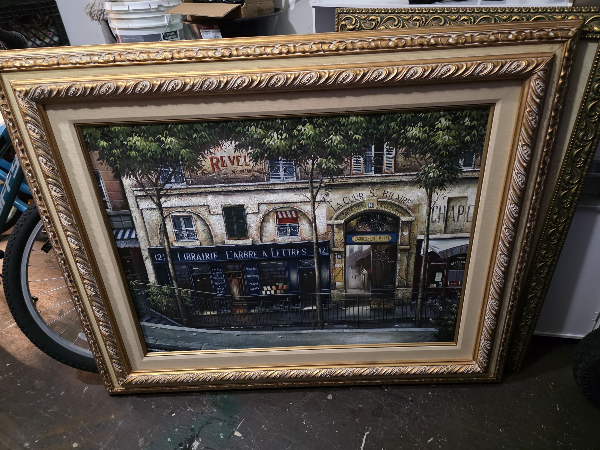 English Elevate your home decor with this stunning, large-scale framed canvas art. It features a beautiful and detailed European street scene, showcasing a charming library and classic architecture. The piece is finished with a high-quality, ornate gold frame that adds a touch of elegance to any room. It is in excellent condition and ready to be the centerpiece of your living room, office, or hallway. Actual Dimensions: * Width: 52.5 inches * Height: 43 inches Español Dale un toque de clase a tu hogar con esta impresionante pintura en lienzo de gran formato. Presenta una escena detallada de una calle europea, con una librería encantadora y arquitectura clásica. La pieza viene con un marco dorado de alta calidad y muy detallado que aporta elegancia a cualquier espacio. Está en excelentes condiciones y listo para ser el centro de atención en tu sala, oficina o pasillo. Medidas Reales: * Ancho: 52.5 pulgadas * Alto: 43 pulgadas