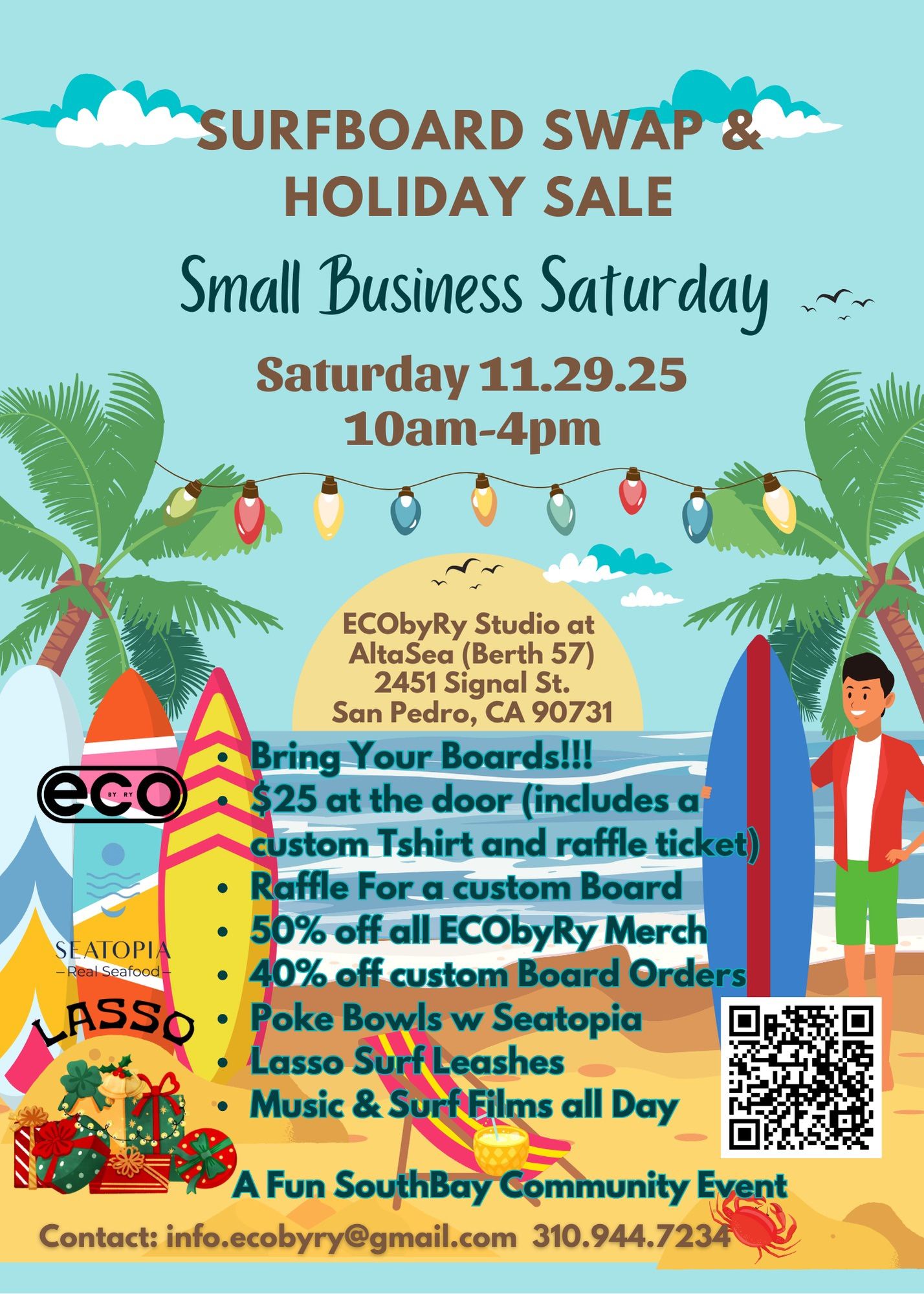Our Black Friday Online Sale is live now through Cyber Monday…but… THIS SATURDAY for the first time since I moved and set up shop at AltaSea…. Our Small Business Saturday Annual event is back! It’s a Surfboard Swap, Sale and full on Function! Here’s the details: Saturday 11.29.25 from 10am-4pm Located at my ECObyRy Factory within the AltaSea campus on the water in the Port of LA (Berth 57) - Bring some boards and get here early for the #surfboard #swap and #sale The more the better! First 25 People get one of our #upcycled wax combs made from plastic beach trash. - Live Opportunity Drawing for a custom board. $25 at the door and you’re automatically entered and you get a custom screen printed tshirt. Bring as many boards as you want for the swap. Buy • Sell • Trade • Live screenprinting on custom tshirts. • There will be food, music and we will be playing surf films all day too • 50% off ALL ECObyRy Clothing and Sustainable Lifestyle products (coasters, wax combs, key chains). • 40% off Any custom board orders placed in person (with a 50% down payment) Hope to see you this Saturday! Tag your peeps. You won’t want to miss it. 🎅🏾🤙🏾
