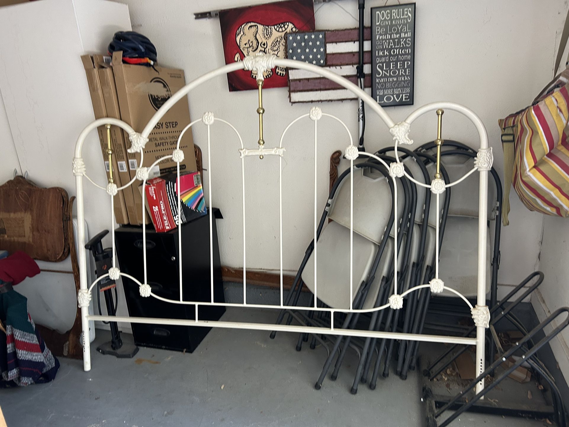 King size headboard • Heavy, well-made iron construction • Brass accents in great condition • Adds charm to any bedroom – cottage, farmhouse, or traditional style • Good vintage condition (minor wear consisten