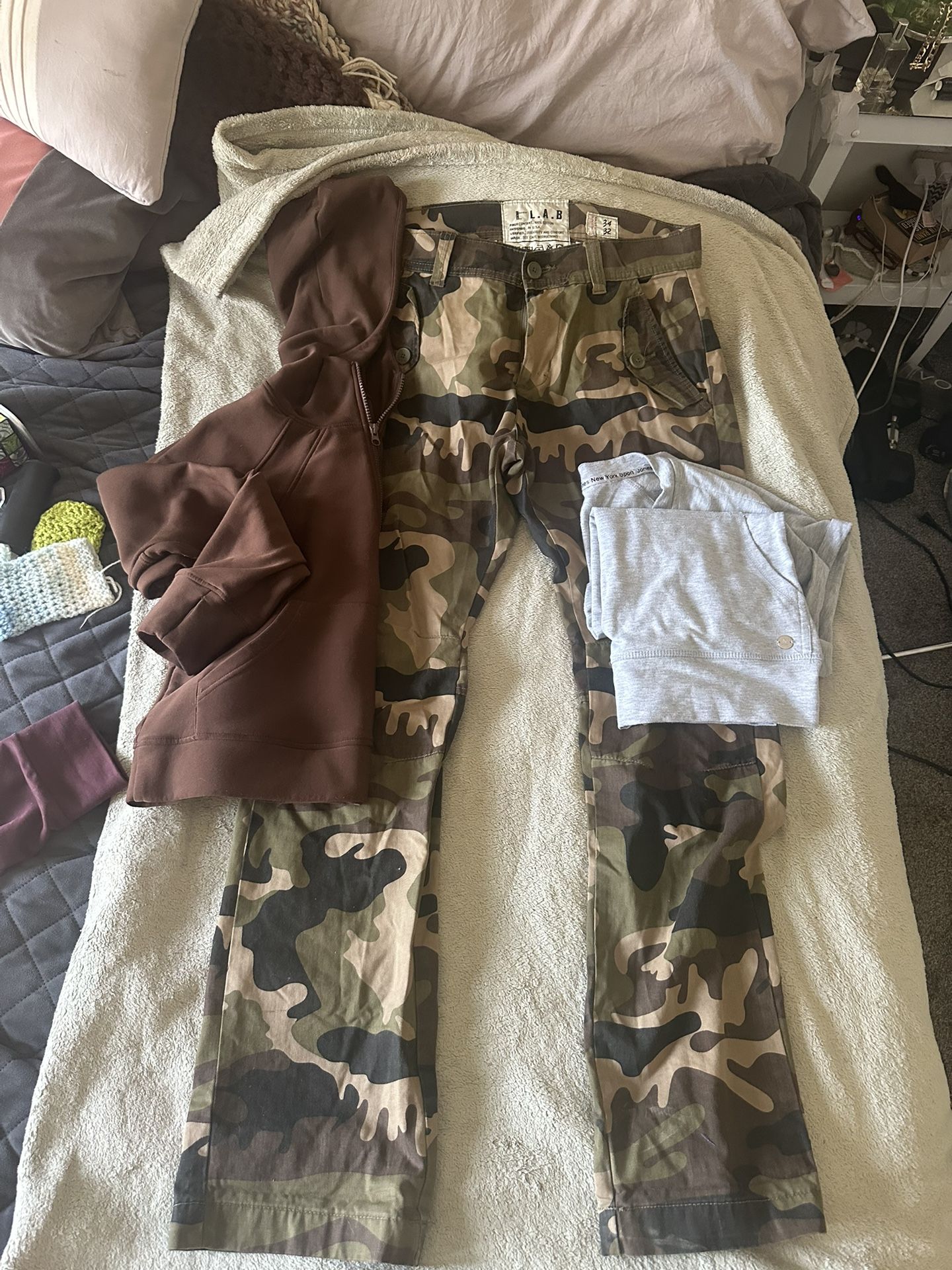 The pants are size 34 waist 30 too long slim straight. They are 100% cotton. The hoodie is a size small women’s. The shirt is Jones, New York sport size small women’s. accepting offers.