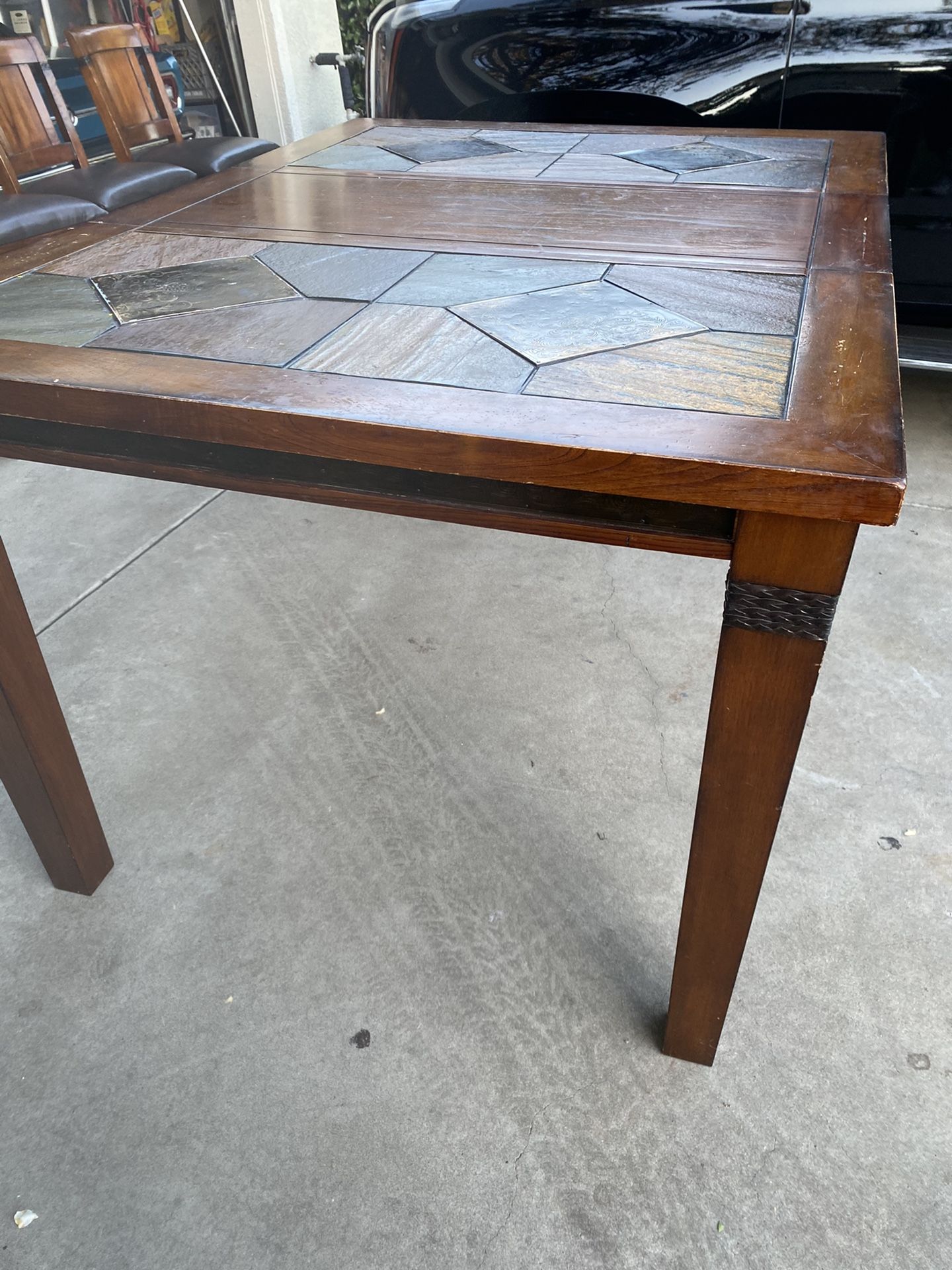 Very heavy!! Paid 1000 at Costco for it I’m asking $300 if your looking for a great quality table then this is it. The chairs have been Upholstered and are new. It has a middle section that can be removed. 5ft long 4 feet wide I’m selling cz I’m moving. Also there a big community garage sale here which is located in Wind Mill park in north Stockton
