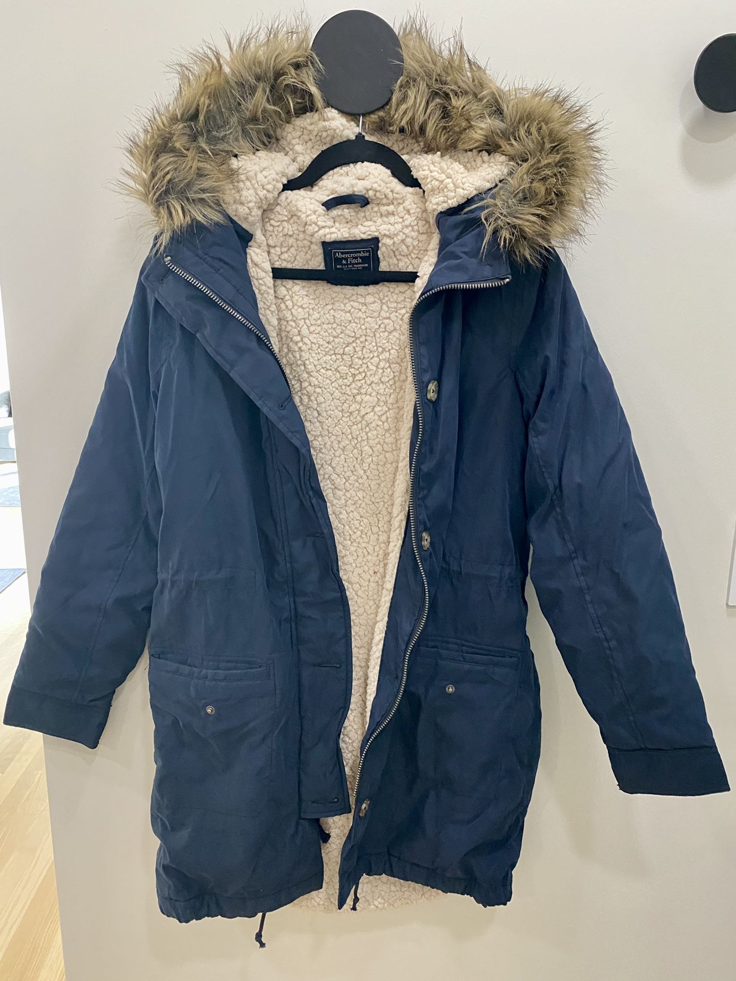 -never used -very warm and comfortable -faux fur hood -knee length -fleece lining -soft water repellent shell -large pockets -zip and button closure -waist drawstring