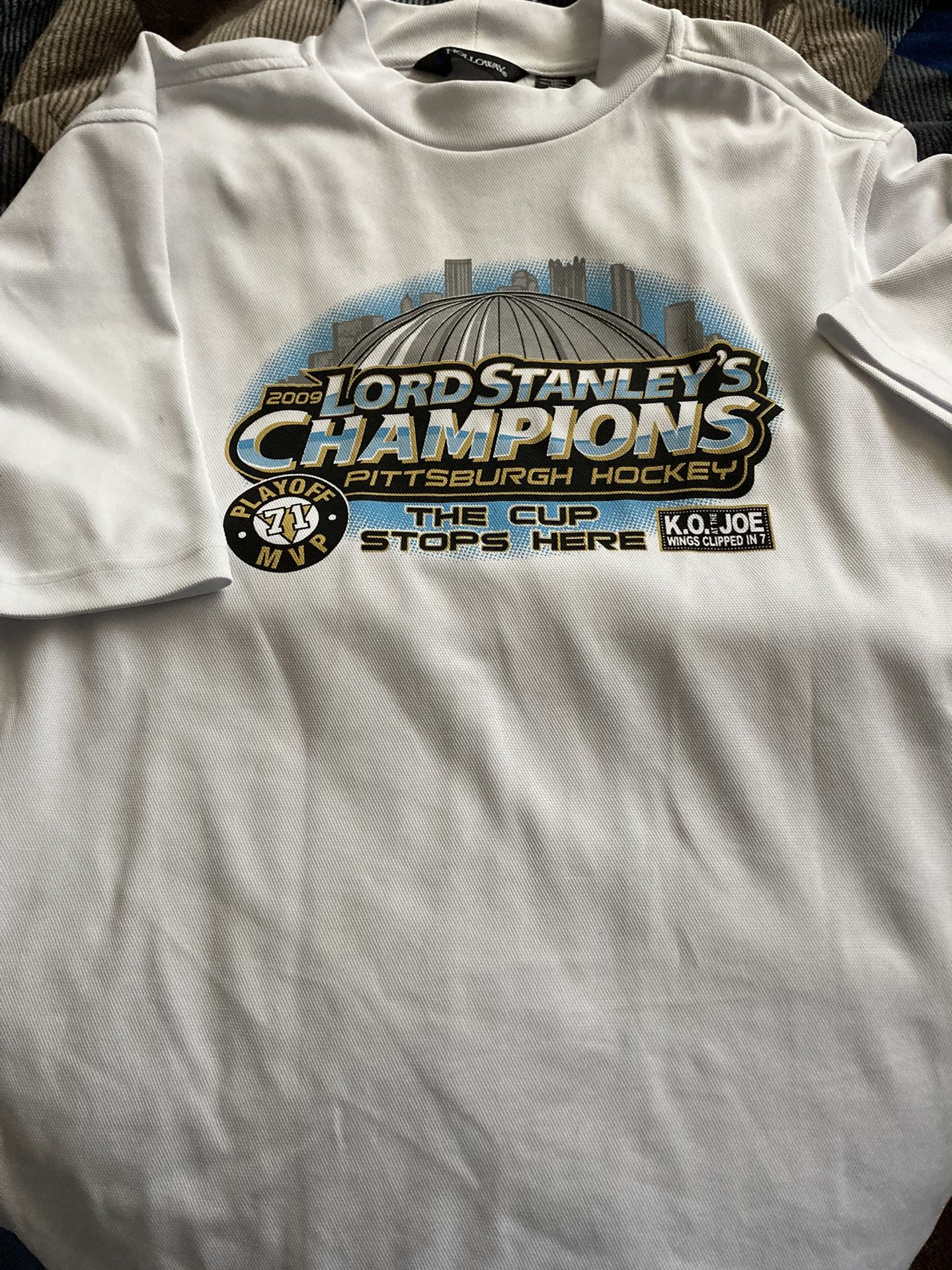 Short sleeve poly knit Penguins shirt new without tags. Has Civic Arena in background. Never been worn, hung in closet. Make it yours. Don’t ask if available. If ad is here, item’s available. Size XL. See less