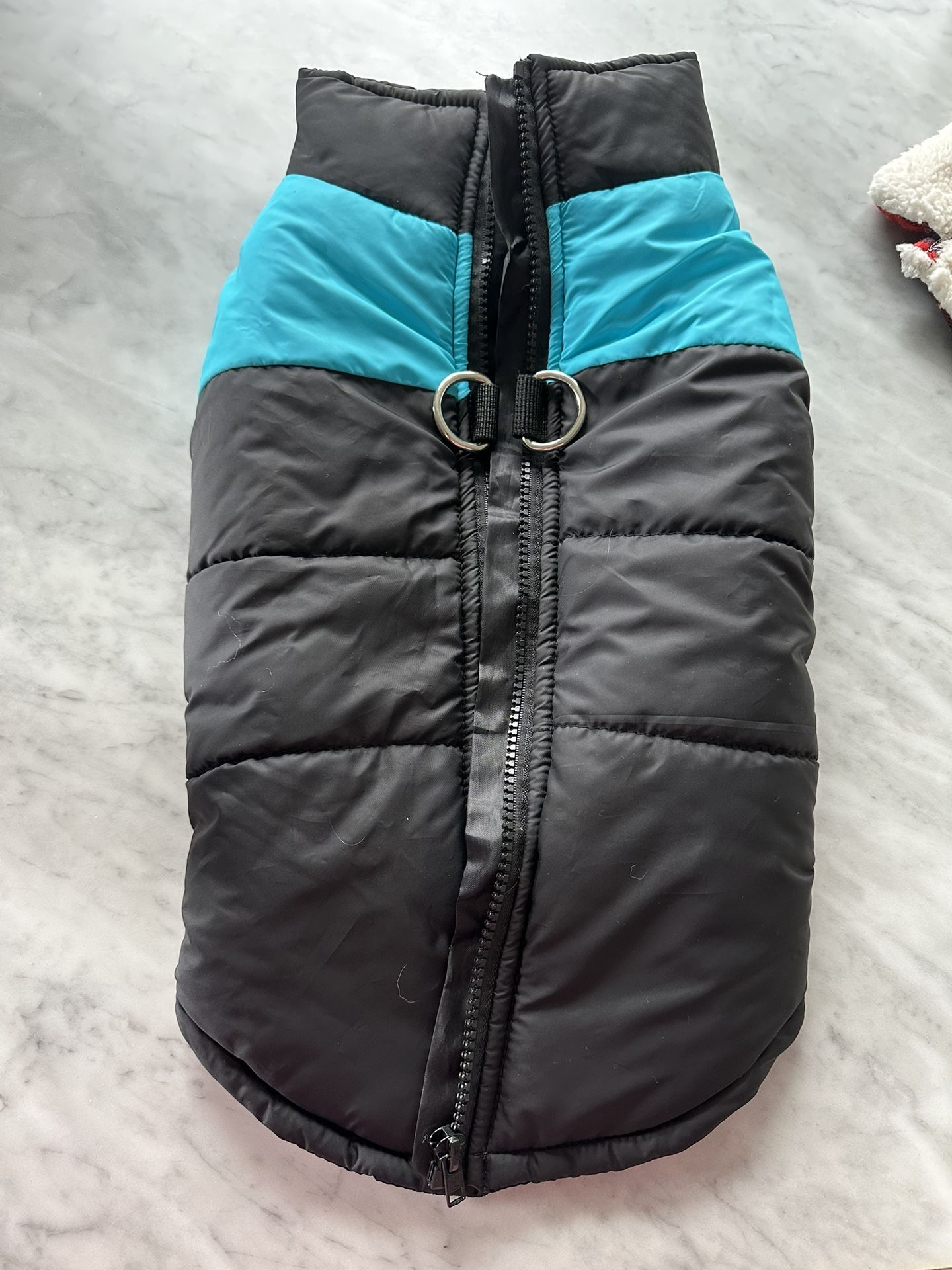 Great coat for short hair dog to keep them warm. Chest 56cm, neck 41cm, cloth length 39cm. Suggested dog weight 16-22kg.