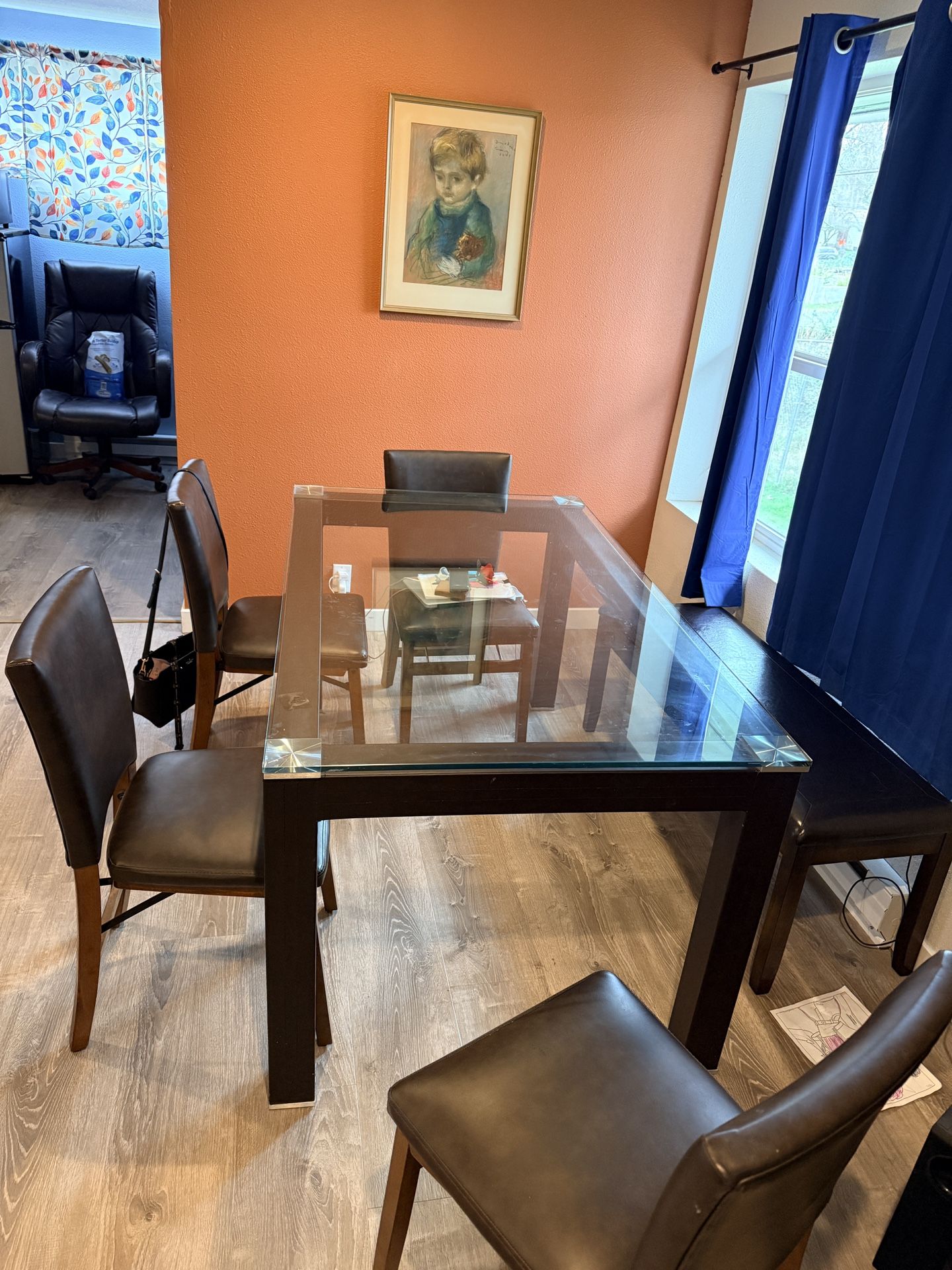 High-end designer dining table featuring a solid steel base wrapped in genuine leather and a thick glass tabletop. Modern, architectural, and extremely well constructed — a true statement piece. In very good condition with a small cosmetic tear in the leather (does not affect function or stability). ⚠️ VERY HEAVY — steel construction and thick glass. Bring help and a suitable vehicle for pickup. Dimensions: 61” L × 36” W × 30” H Price: • Table: $700 Optional (sold separately): • Faux leather folding chairs – $100 18” W × 20” D × 33” H • Bench – $25 46” L × 19” W × 19” H Pickup only. Message for details or additional photos. Price reflects quality and condition. Serious inquiries only.