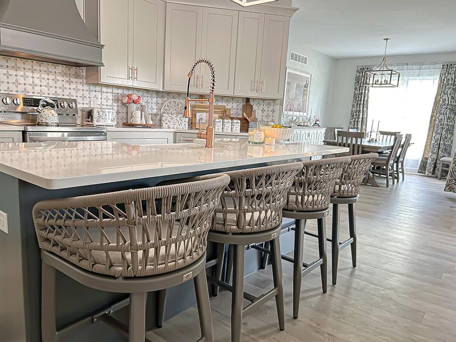 New PURPLE LEAF Set of 2 Outdoor Rattan 29" Bar Stools, Modern Boho Aluminum Patio Bar Height Chair with Cushion and Back for Outdoor and Indoor, Champagne New in box 30518-75 unit 11 * Modern Style: Embrace a sleek and modern aesthetic with our bar stool, designed to effortlessly blend into contemporary spaces. The clean lines, minimalist silhouette, and sophisticated finishings of this stool add a touch of modern elegance to any room, making it a versatile choice for various interior design schemes. * PE Rattan Backrest Design: Featuring a unique rattan backrest design, our bar stool stands out with its distinctive and stylish element. The woven rattan adds texture and visual interest to the stool, creating a harmonious balance between sophistication and nature-inspired charm. * Sturdy Aluminum Frame: Our bar stool boasts a robust aluminum frame that not only exudes quality craftsmanship but also ensures lasting durability. The lightweight yet sturdy nature of the frame makes this stool easy to move around while providing stability and support for daily use. * Comfortable Seating: The counter stool cushion is made of elastic memory foam; the soft padding not only enhances the overall comfort level but also ensures that you can relax and unwind in style while enjoying drinks at the bar or socializing with guests. outdoorbar #barstool #outdoorfurniture #patioinspo #backyardinspo #luxuryoutdoor #modernoutdoor #outdoorliving #poolside #backyarddesign #outdoordecor #resortstyle #modernbackyard