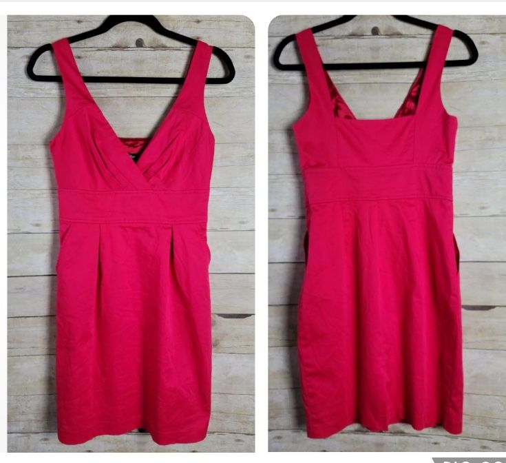 Length 34”, pit to pit 14”, waist 26”, hips 32” Lined lightweight machine washable 99% cotton, 1% spandex Sleeveless, v-neckline, sheath, solid, ruched detail, pink Casual party cocktail knee length sundress with pockets Excellent condition Great for any occasion