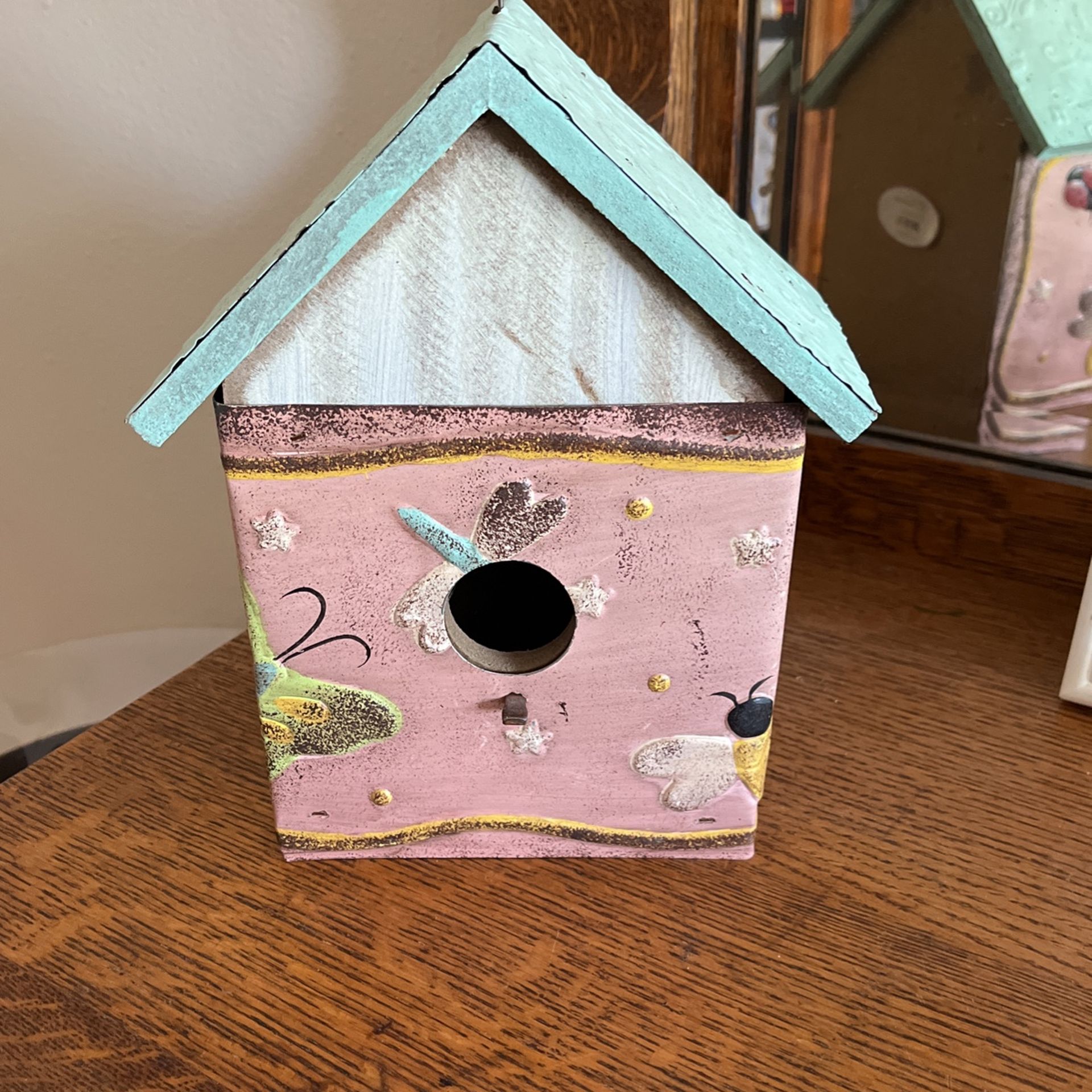 New birdhouse decor. This is for decoration. The roof and sides are metal wrapped around wood. 9” tall and 5” wide