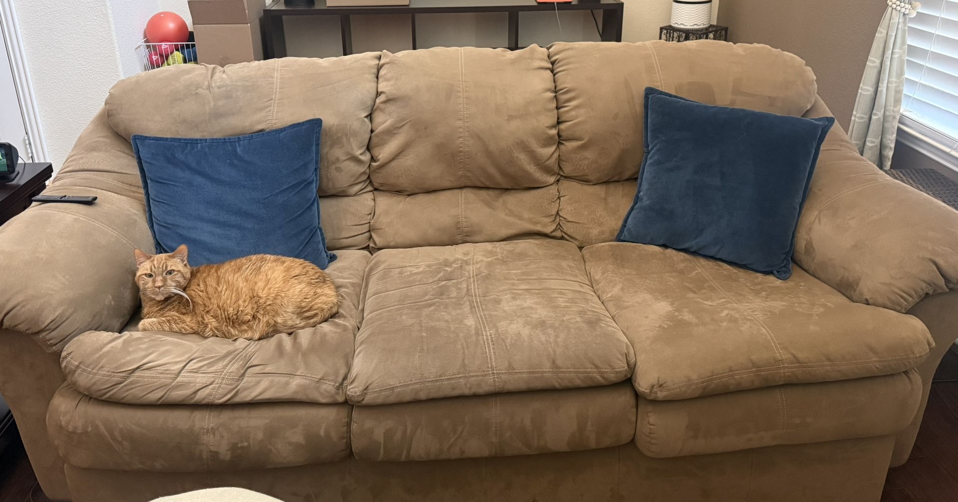 Beige microfiber couch. Blue throw pillows not included. One cushion more warn than others but great shape otherwise. *cat not included ☺️