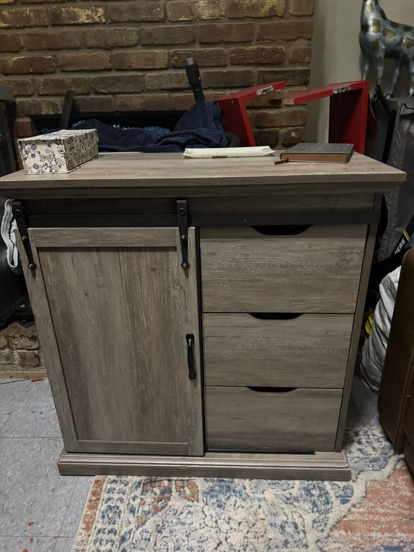 31.5” Gray Sideboard/Cabinet With Sliding Door And 3 Drawers. Overall dimensions are 31.8”H X 31.5” W X 15.7”D. Weighs 63 lbs. For use as a budget, side bar, nightstand. Whatever you choose. Sliding door moves aside to reveal one adjustable shelf inside. The other half features 3 slide out drawers. All useful storage space. Closed back. Comes disassembled with all hardware, took and instructions to put it together. Very nice. Sturdy cabinet. Great conditions. Originally $299!