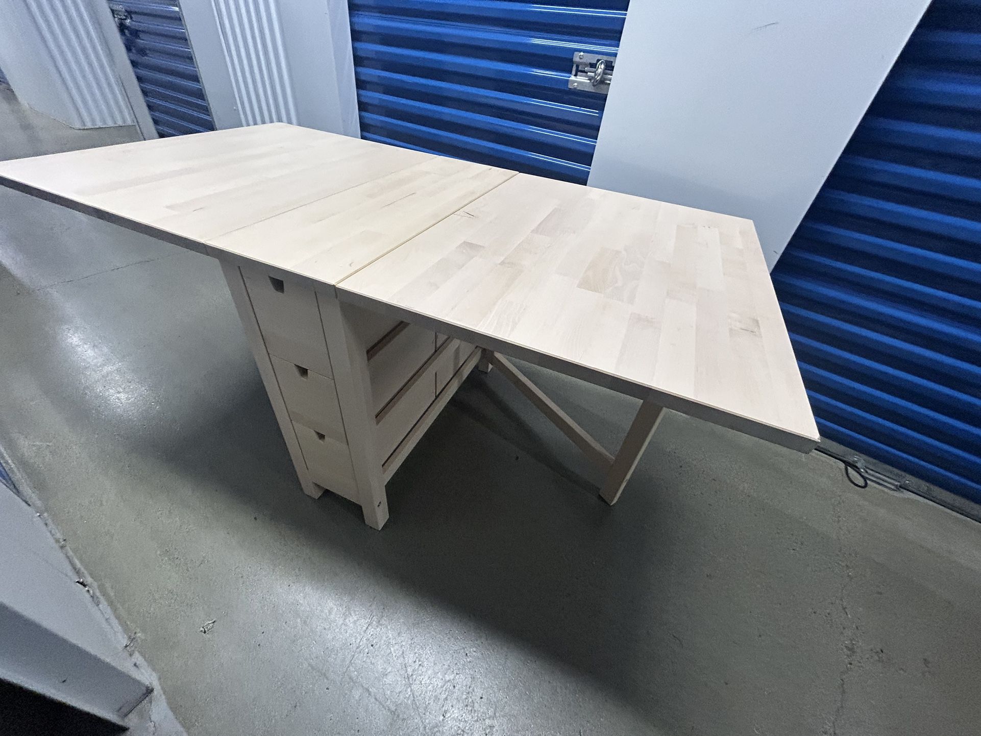 Gateleg dining table with 6 drawers for storage! Great condition, one small scratch on top of one leaf. Length 35” Width 31.5” Height 29 1/8” Picture has further dimensions.