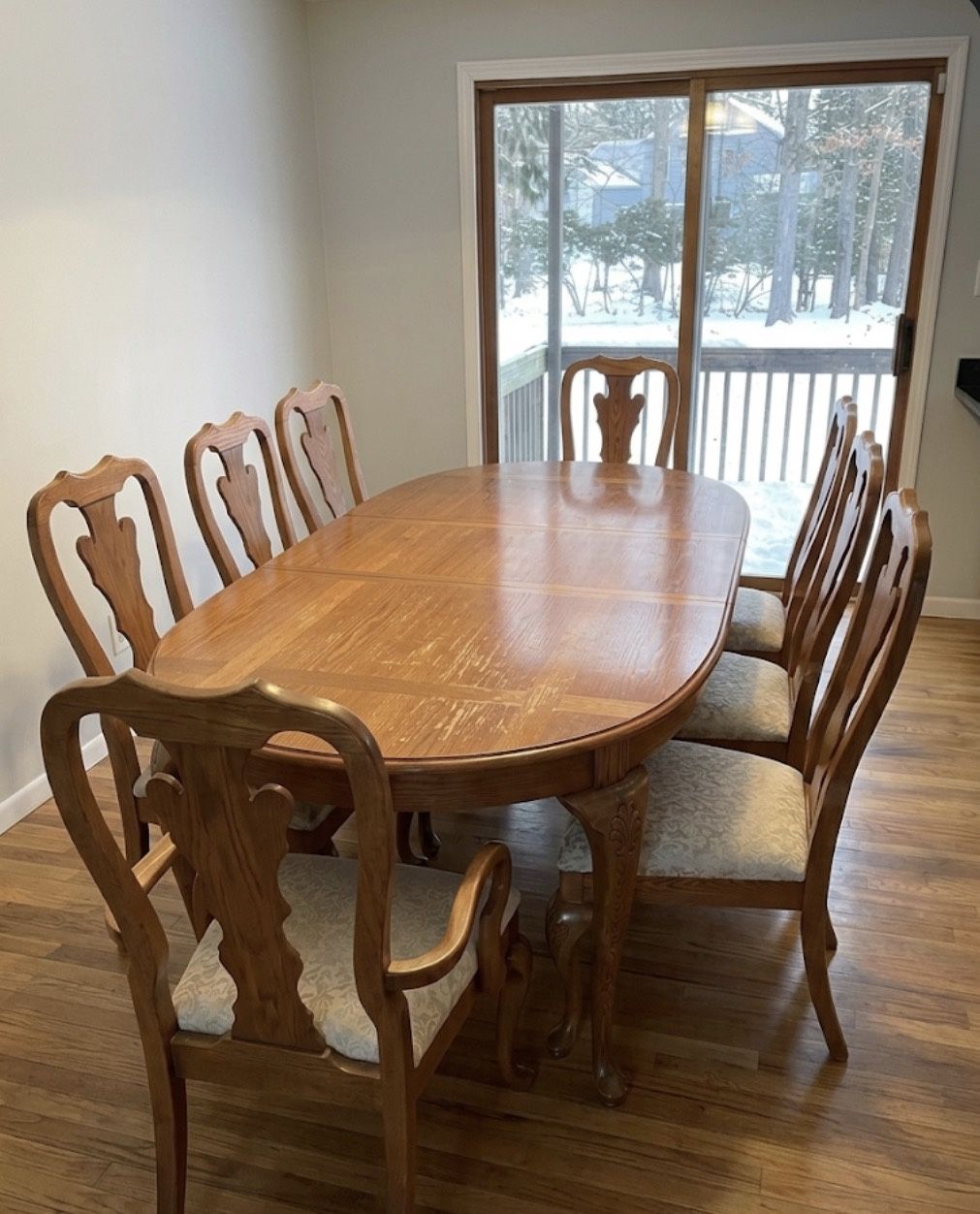 Selling this high-quality, sturdy oak dining table along with 8 matching chairs. We are redecorating and priced this to sell quickly. Classic oval design with beautiful pedestal legs. Includes 1 extension leaves to comfortably seat all 8 people. 8 matching solid wood chairs with upholstered seats. Being transparent—the tabletop has some surface scratches and the chair cushions have some staining from family use. Because it’s solid wood, it is a perfect candidate for a quick refinish or steam clean. Asking $400. I am open to reasonable offers, but please no lowballs as this is a high-end solid wood set. Must pick up in Morris Plains/Parsippany area (07950).