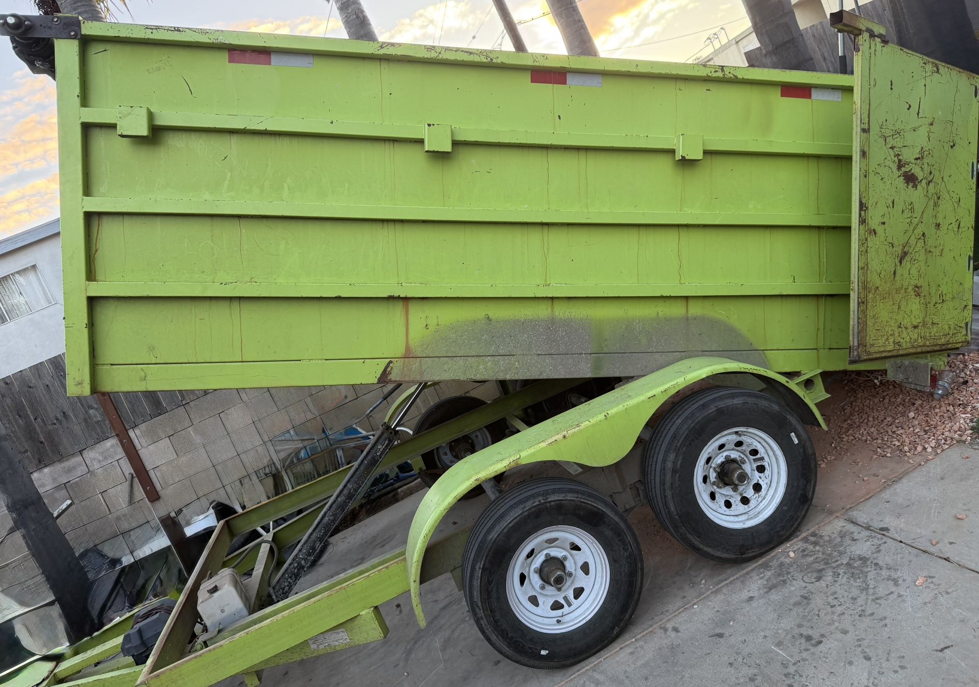 $12,000 1. Traila de dompe 12 pies de largo 8 de ancho 4 pies de alto Tiene tarp Tiene rampas para subir un bobcat Tiene llantas de sunket para peso pesado