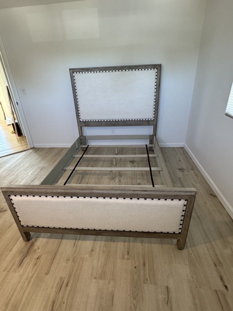 padded head & foot boards light color fabric roll up mattress slats asking $150 or best offer very good condition already disassembled ready to go