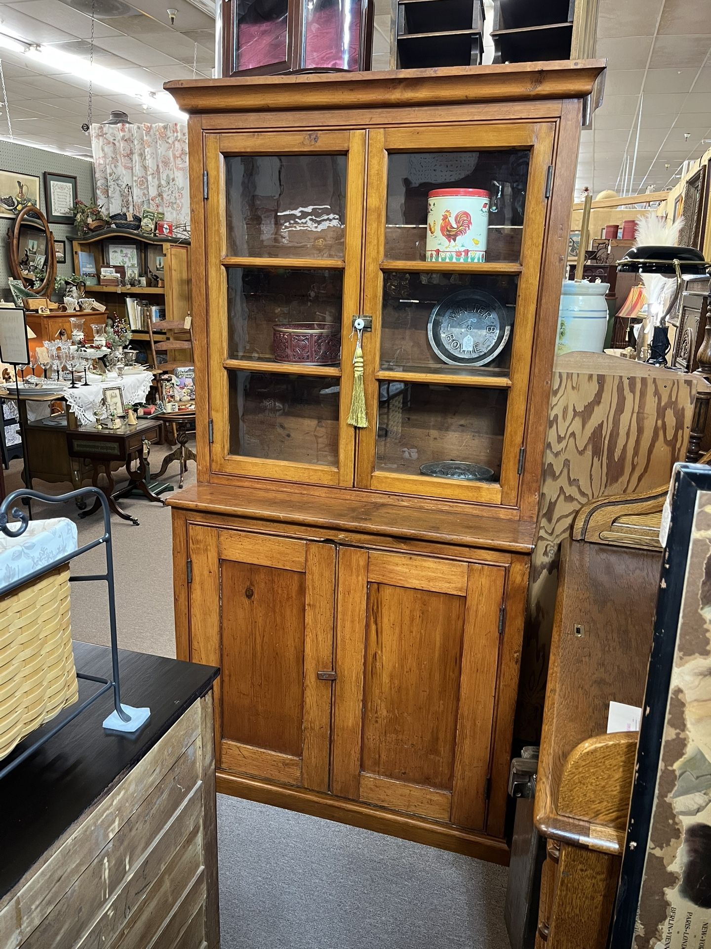 Antique 1880’s rustic primitive kitchen cabinet with display curio on top. This can be found in booth B7. See photos for location and other info. Measures about: 41.5” wide, 18” deep, and 75.5” tall