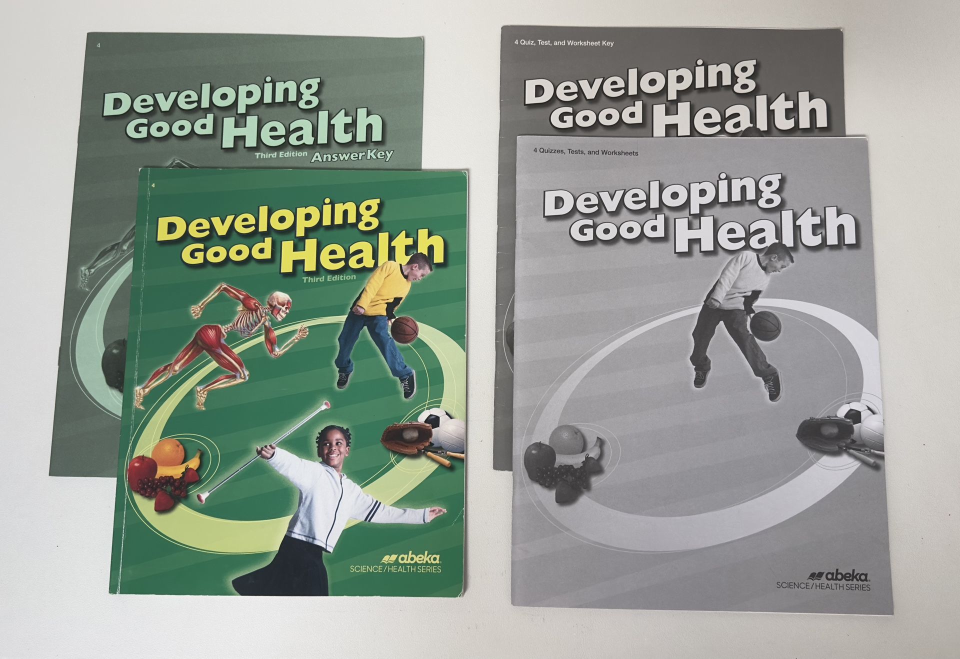 Abeka developing good health grade 4 curriculum. Four books: Text Answer key Quizzes tests and worksheets Quizzes tests and worksheet key All in very good used condition no writing no marks