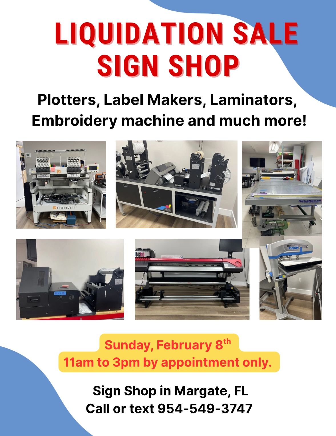 Everything must go! Sign Shop in Margate Closing Due To Owner’s Death. Selling all equipment. Able Signs Make an offer. Vinyl rolls, printing machines, label makers, embroidery machines, Plotters, computers and much more. Text (contact info removed) if you want to see them in person. Make us an offer everything must go by the end of February!!