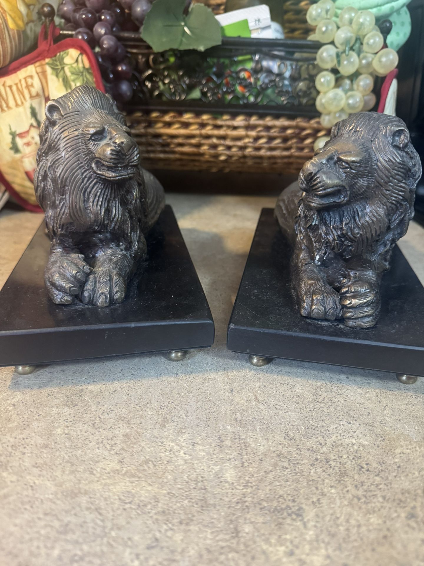 Two beautiful figurines of lions. Made by the company Bombay, these are quality pieces. One figure has slight moment.