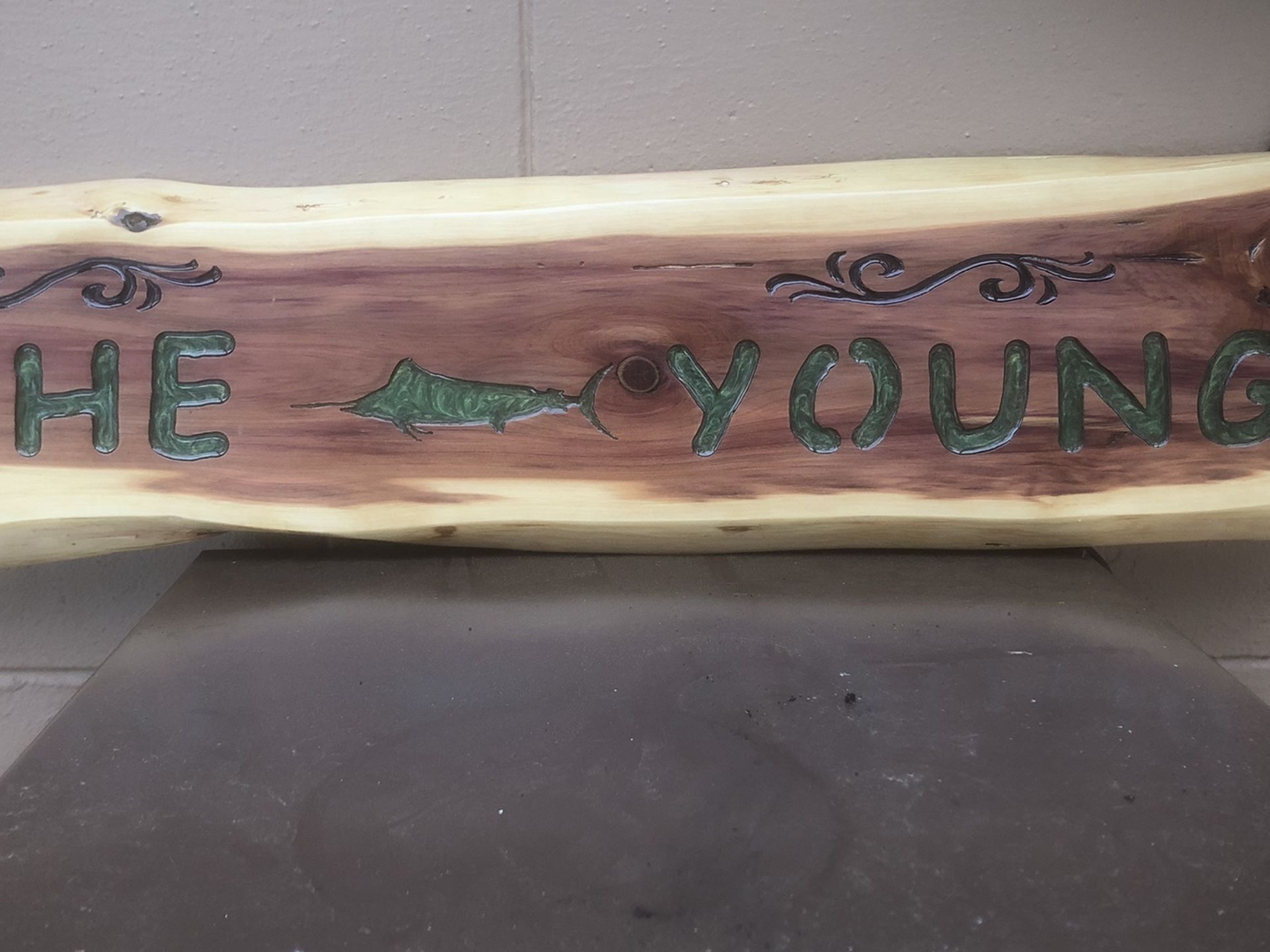 Personalized signs your choice of wood between Elm, and Cedar. Your choice of natural or stained with apoxy inlay your choice of color.