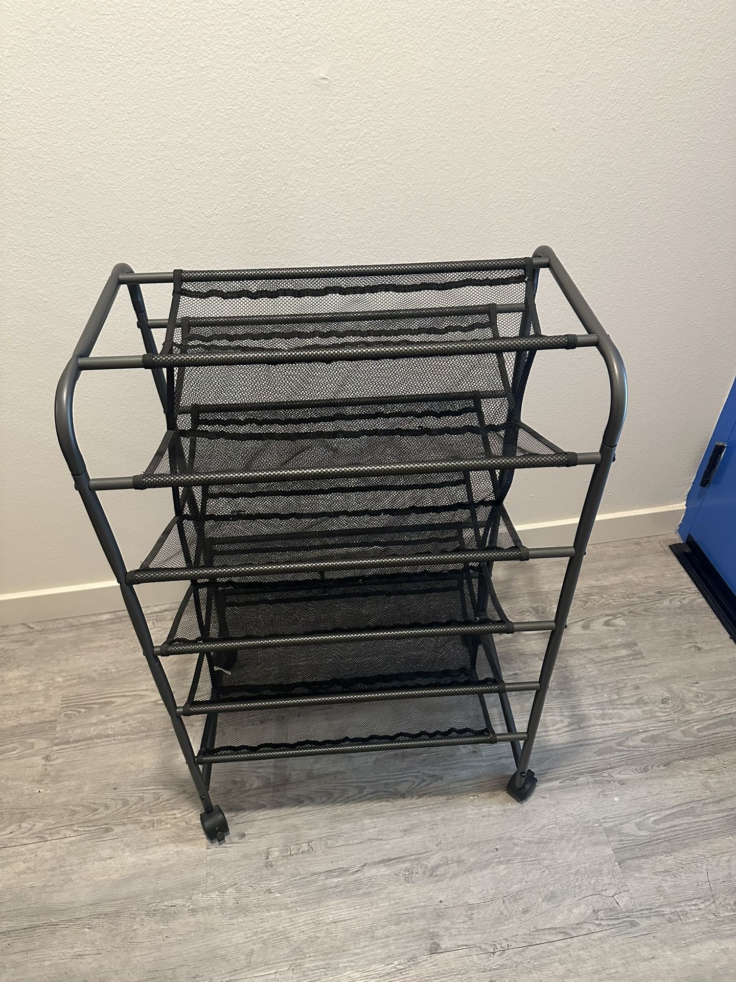 Used double sided shoe rack. About 3 1/2 feet tall, 2 foot wide.