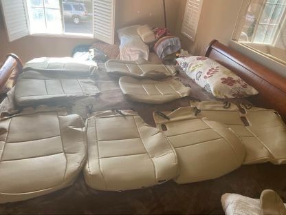 Great condition beige seat covers. Everything included to fit similar models. One set of arm rests missing. Some straps had to be cut but will still tie. I have number of man who installed them for me.