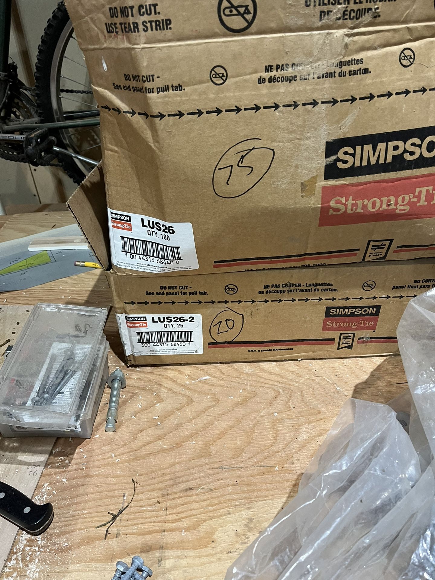 TITEN- 5@ THD75812H 3/4”x8-1/2” Heavy duty screw anchor 35@ THN25334HSS 1/4”x3-3/4” Concrete and Masonry screw Simpson 15@ DTT2Z Deck tension tie 8@ HU7 4@ LUS210 N-2Z 2@ HUC68 2@ AC6 (contact info removed) TR 6@H1 4@ BC4Z 100@ LUS26 25@LUS26-2 70@ A35 1@ A34 8@ A23 15@ MSTA36 6@ L70Z 6@ L90Z