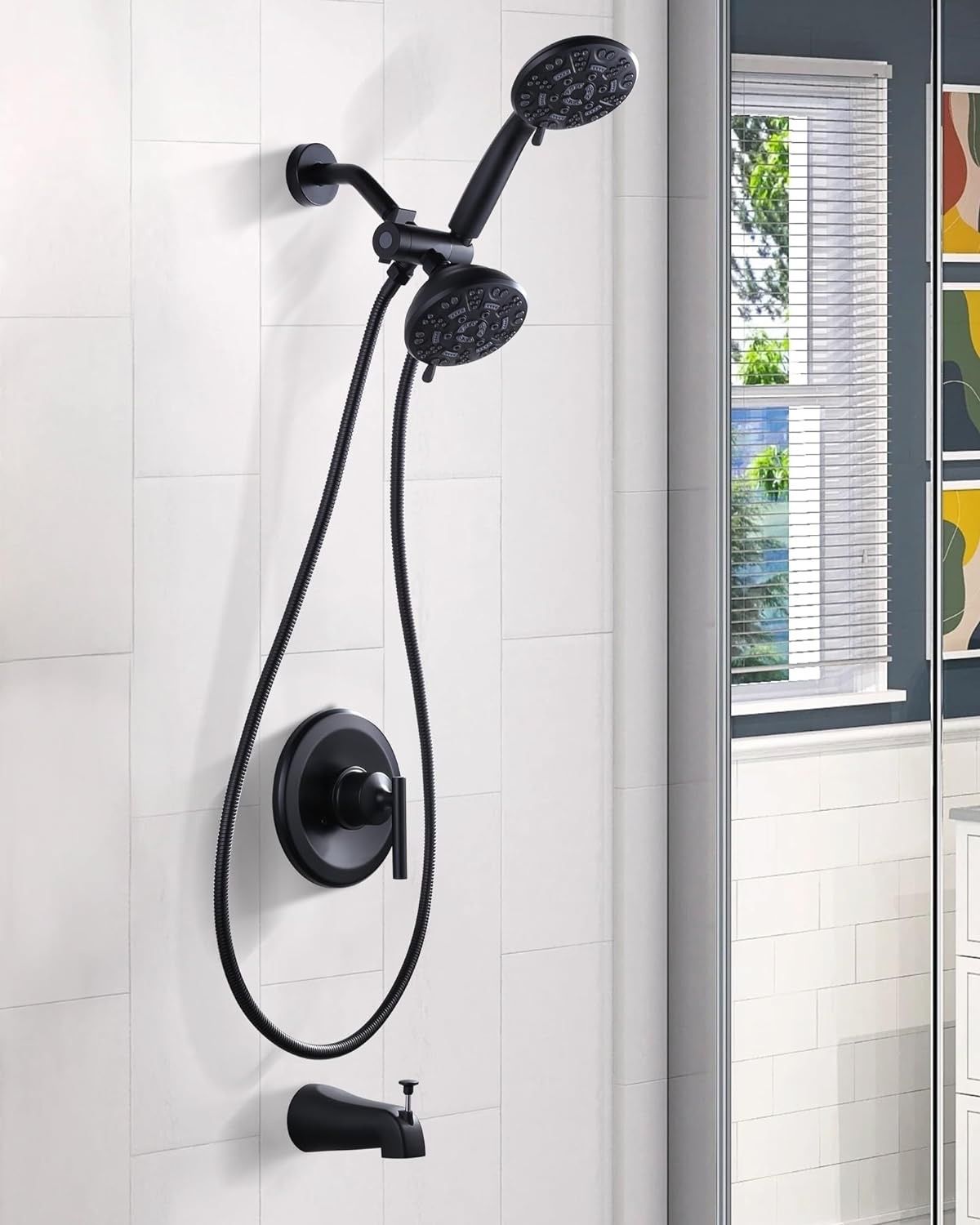 Matte Black Shower Faucet Set with Tub Spout and 7- Mode 2-in-1 Dual Handheld Shower Head, Shower Trim Kit Single Handle Shower Combo Set Wall Mounted