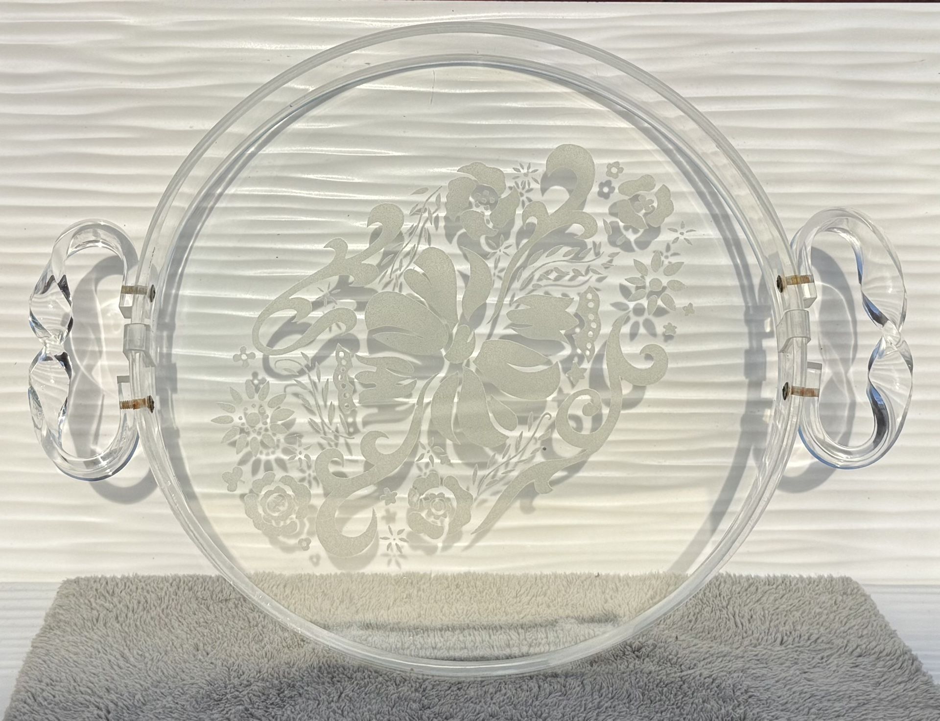 Unique 12" Round Vintage Lucite Serving Tray Handles Etched Floral