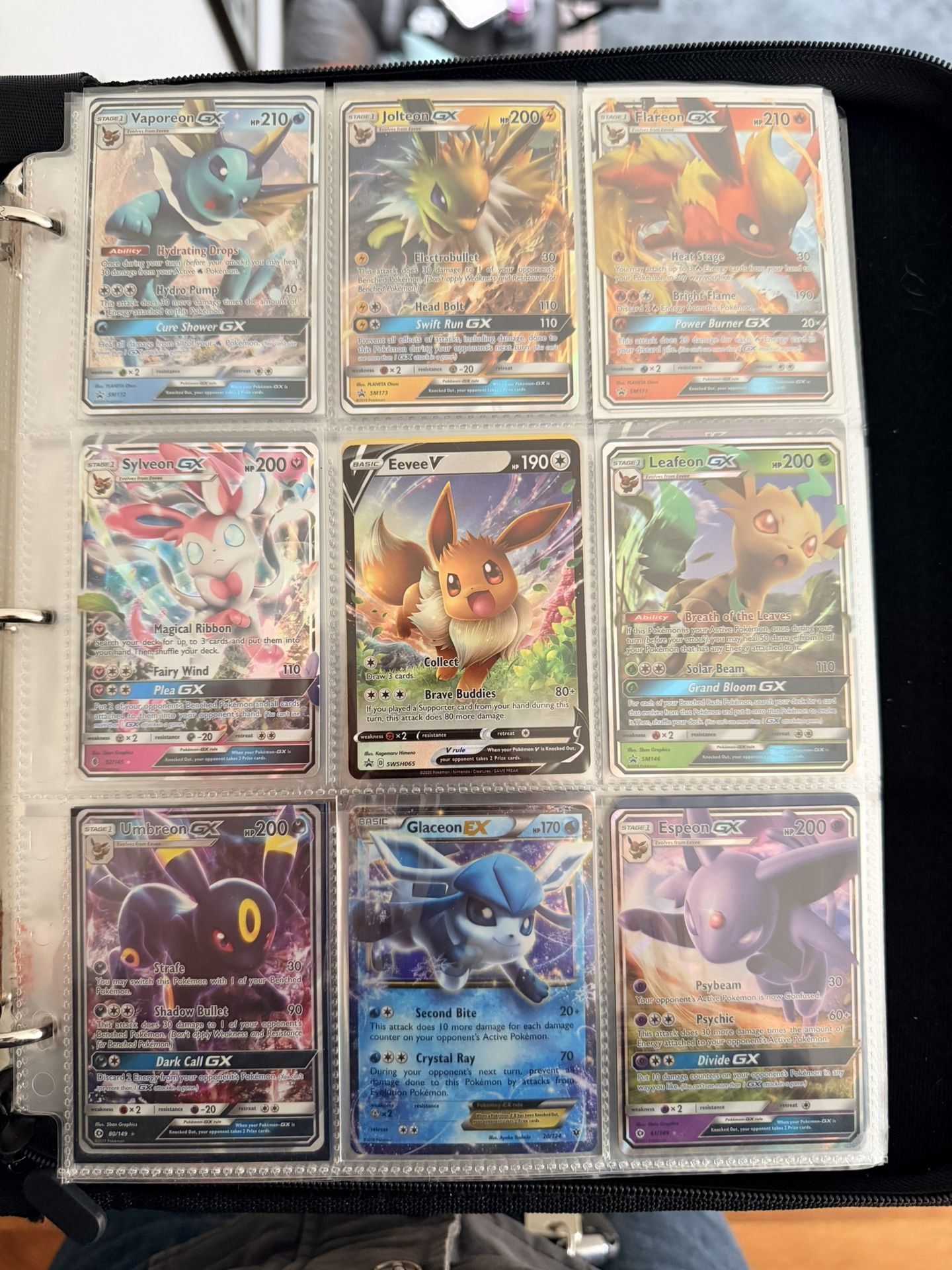 All cards NM awesome set with each one of the eevee evolutions. Message for pricing on ones you’re interested in. Pickup only cash only. Vaporeon pg 1 $10. Whole first page bundle Flareon pg 1 $10. $100 ($30 off) Jolteon pg 1 $10. (9 cards) Eevee pg 1 $10 Leafeon pg 1 10. Slyveon vmax $20 Slyveon pg 1 $25. Espeon vmax $15 Umbreon pg 1 $20. Vaporeon vmax $10 Glaceon pg 1 $15. Vaporeon v pg 2 $5 Espeon pg 1 $10. Glaceon V $5 Leafeon V $5 PAGE 2 BUNDLE $50 (10 off)