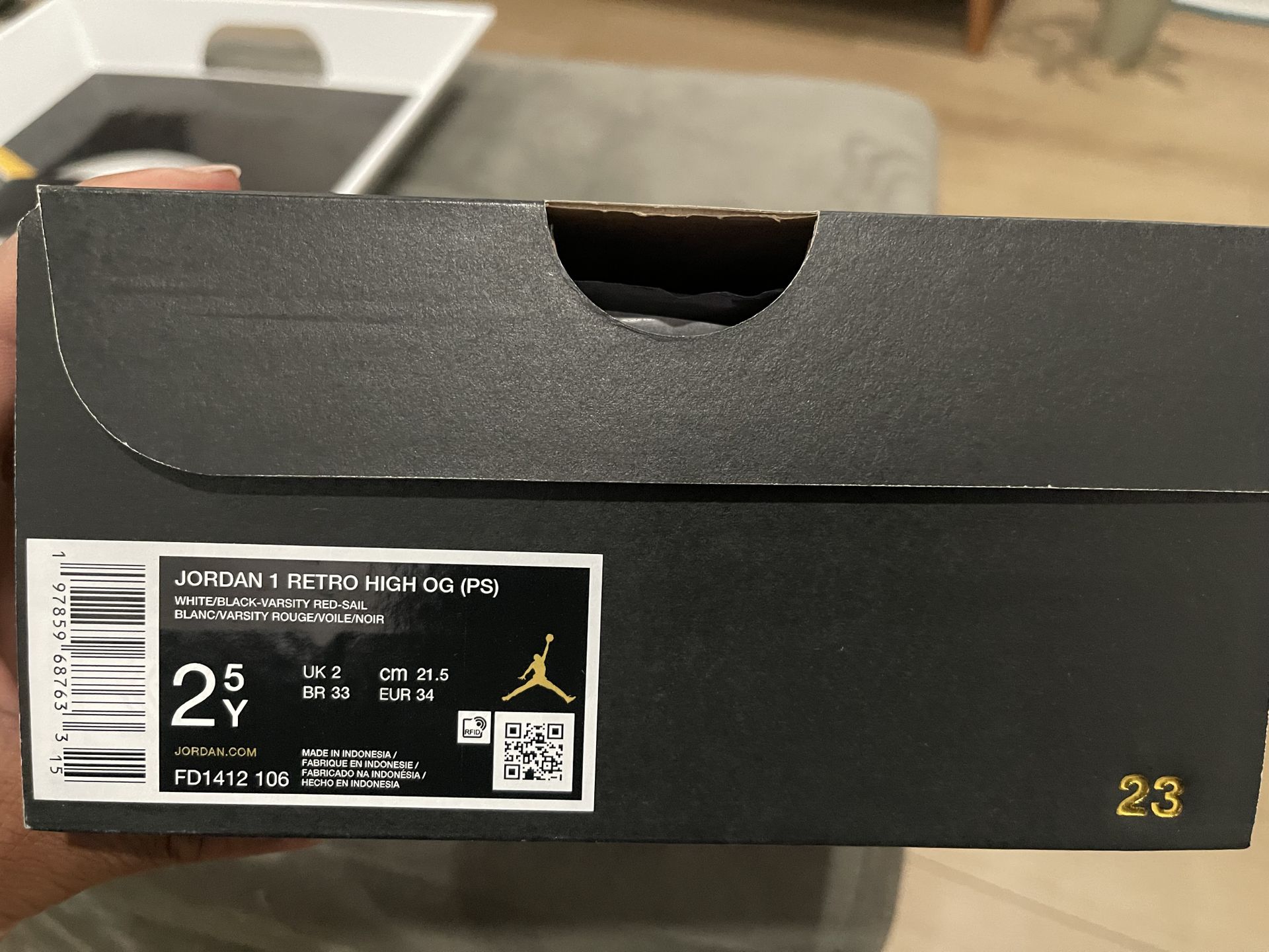 Classic Jordan 1 Retro High OG PS sneakers. Sleek black, red and white design with gold accents. Brand new in box. Size 2.5Y