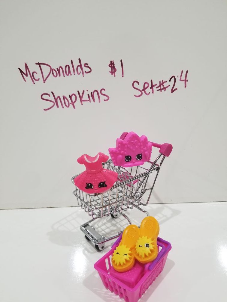 McDonald's shopkins set 24. Includes 3 shopkins and 1 bag or basket. Shopping cart not included just used for photos.