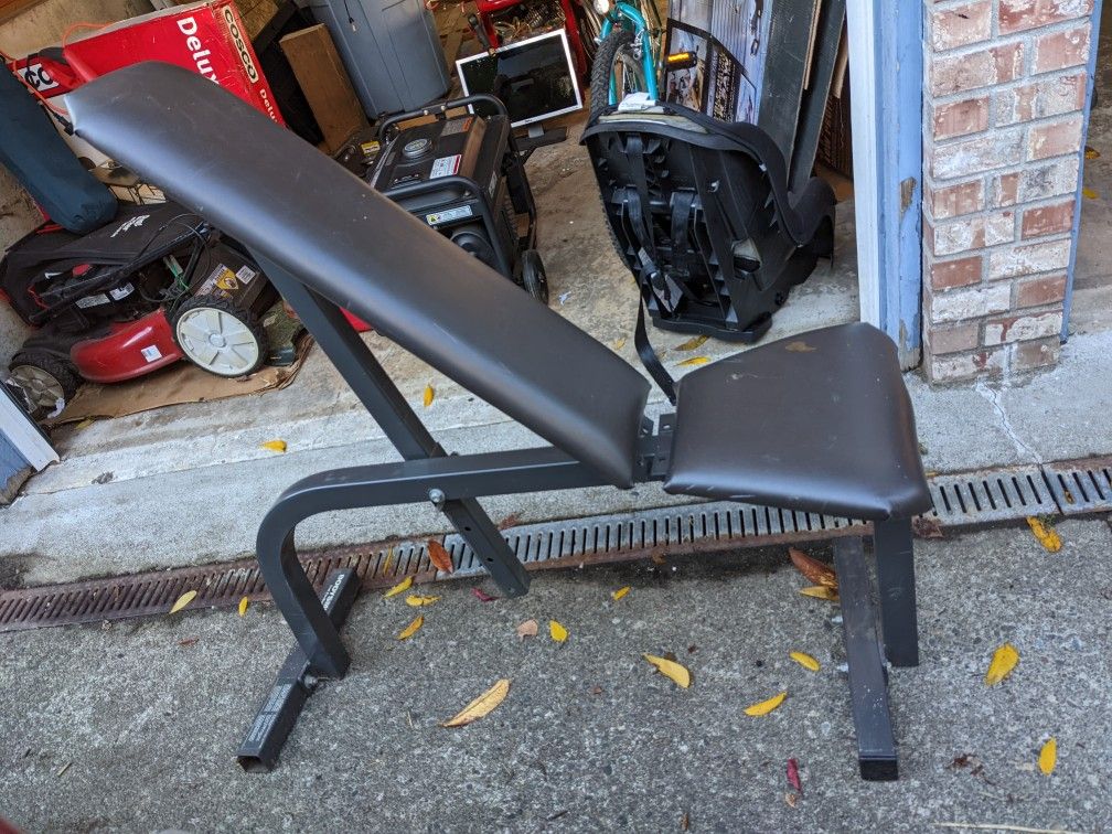 Weight bench - Incline or flat Missing plastic cap for one foot (cosmetic) Padding has scuffs, but no tears Look at photos to see condition, please ask questions before pick-up Cash only, price firm