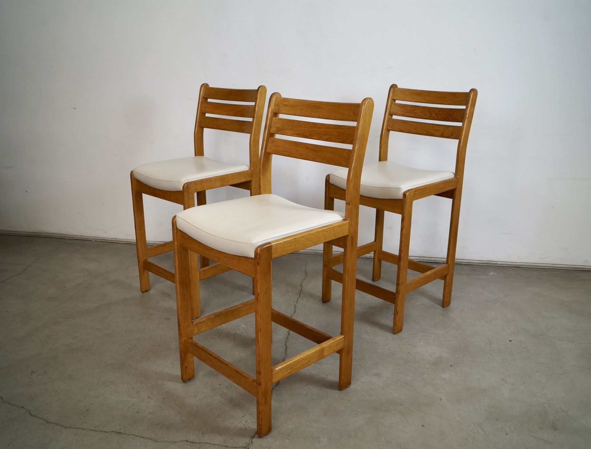 Set of three Mid century Modern counter stools for sale. These are really solid and well made, and are made of solid oak and have been reupholstered in quality Italian white leather. They have a ladder back, and have a curve to the seat. They have rounded edges to the seat and frame and legs, and have the original finish still nicely intact. They have been cleaned and polished, and have a nice open and airy Scandinavian design in the manner of Niels Moller. These are counter height bar stools. The measurements are 40 1/4" tall x 17 3/4" wide x 20" deep x 25 1/2" seat height. Delivery can be arranged. Please check my other listings! π Mcm mid-century barstools bar stools