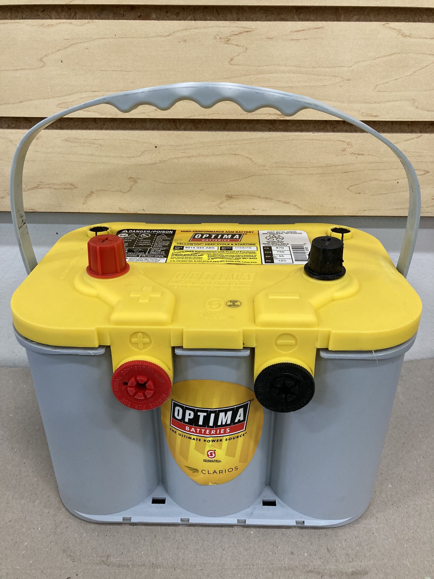Car battery Optima, yellow top gel, AGM deep cycle and starting reconditioning universal size 34/78 hyper performance side and top connections for sale price include core exchange. Please send your vehicle info or ask me any question and check my other pictures for more cars and trucks batteries.
