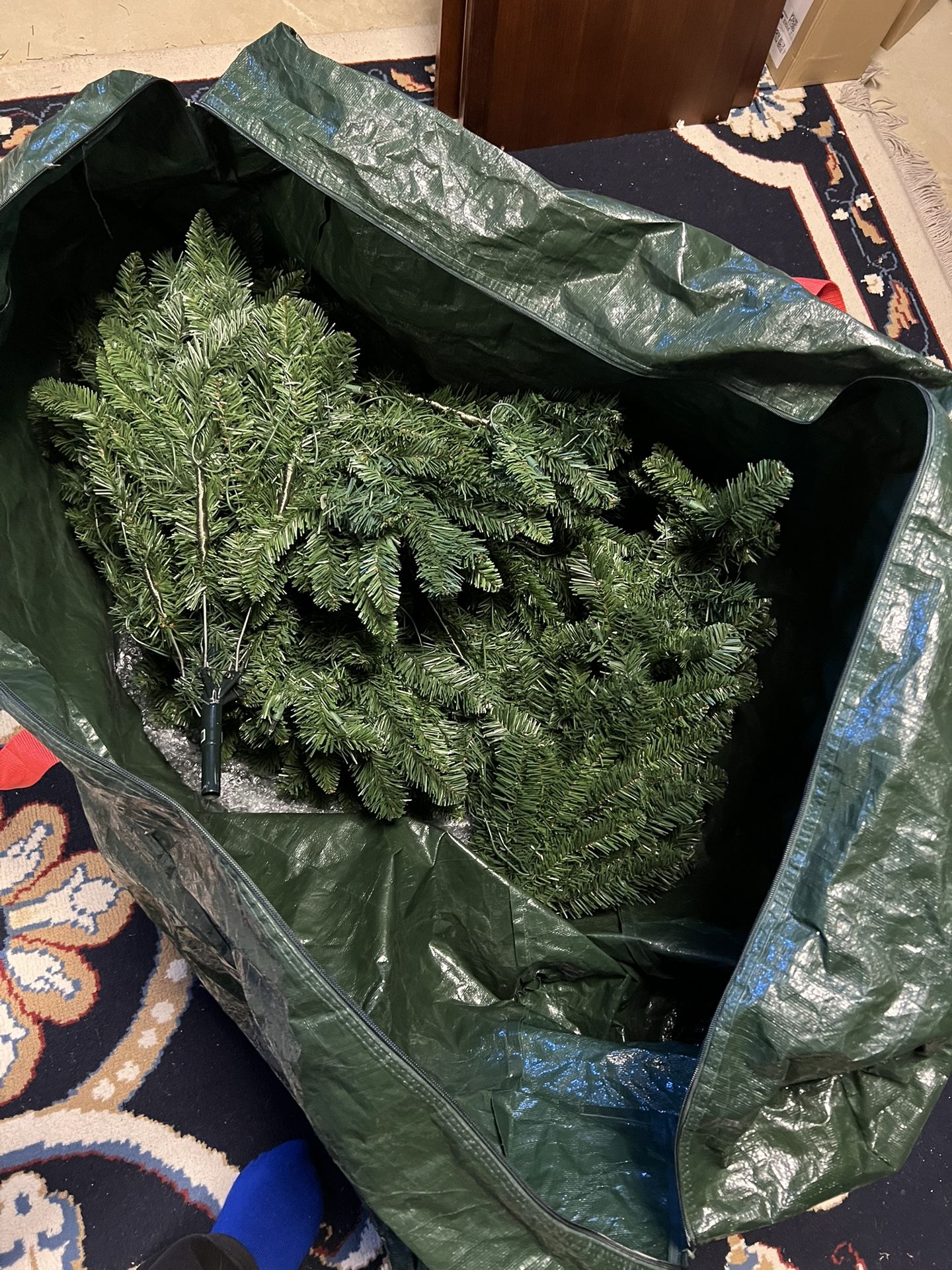 Just in time for Christmas. Approximately 6 foot tall, three sections, all white lights, currently in its storage sack. All green. Ready for immediate pick up.