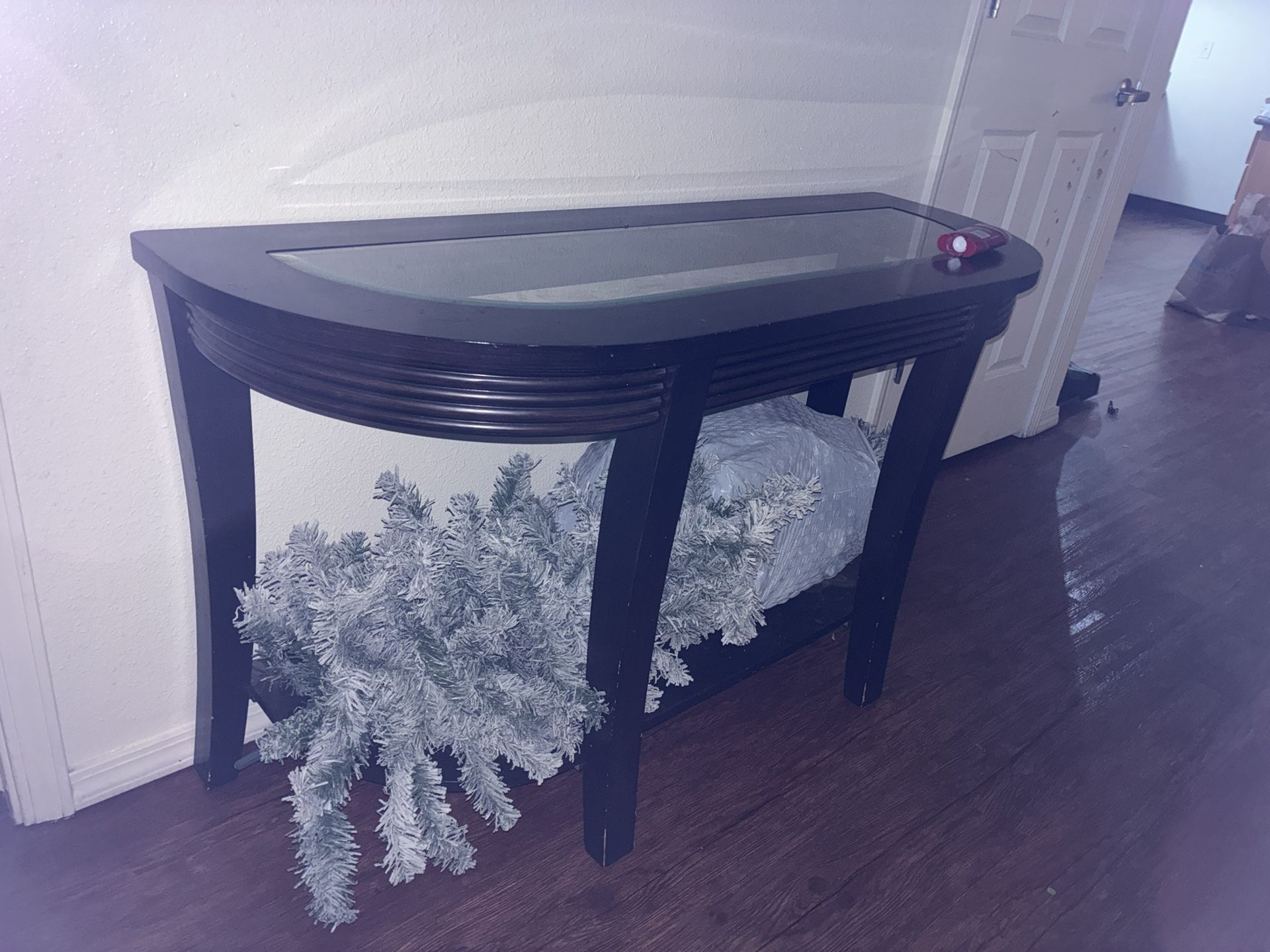 Dark brown with glass top, could be used in the hallway or behind a couch table area. $40 OBO , just need it gone