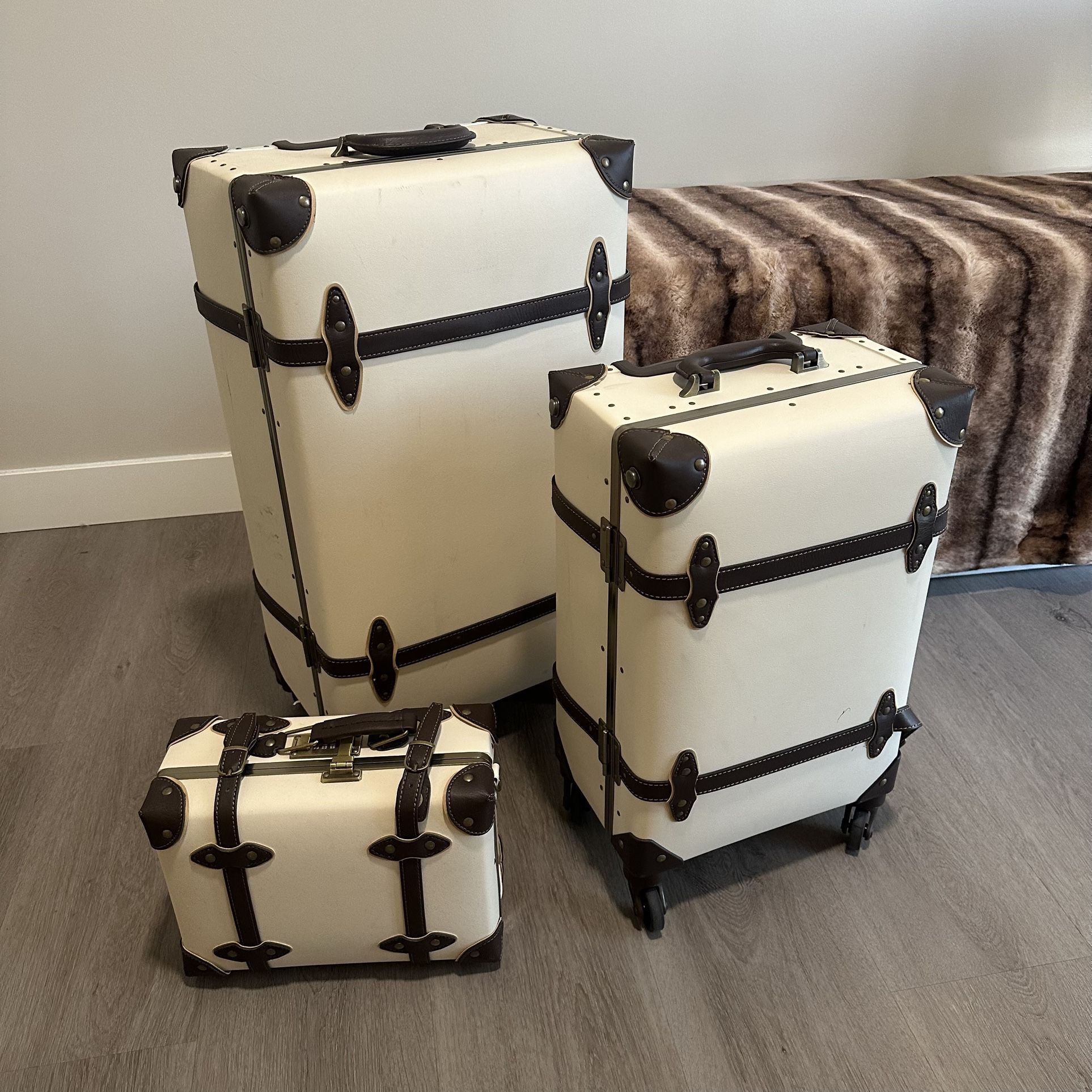 HANDCRAFTED VINTAGE AESTHETIC: Evoke the charm of a bygone era with this stunning luggage set. Featuring hand-stitched faux leather trim and classic craftsmanship, it is designed for travelers who value timeless style LIGHTWEIGHT YET DURABLE: Constructed from a premium faux leather and PP blend, offering exceptional durability without the weight. Features a durable, three-section aluminum alloy telescopic handle and ergonomic grip for comfortable handling REINFORCED ALUMINUM FRAME: The aluminum alloy framework provides robust support and structure, while pressure-resistant reinforced corners offer superior impact resistance for increased longevity BONUS PROTECTIVE PVC COVER: Includes a clear, durable PVC cover to protect your luggage from scratches, dust, and water during travel, preserving its elegant finish, ensuring your suitcase stays in pristine condition during transit I use it a few times as you can see there is visible wear and tear. Pick up in Glendale.