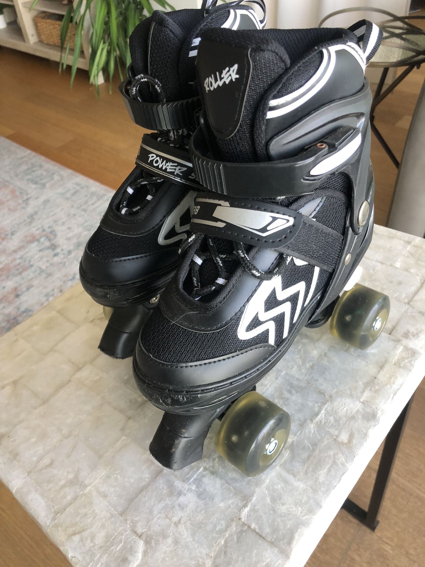Black kids roller skates Adjustable size (big kids 1 - 4) Light-up wheels Solid ankle protection Worn only twice and stored in the closet. Pick up in Marina del Rey. Reduced price. Thanks!
