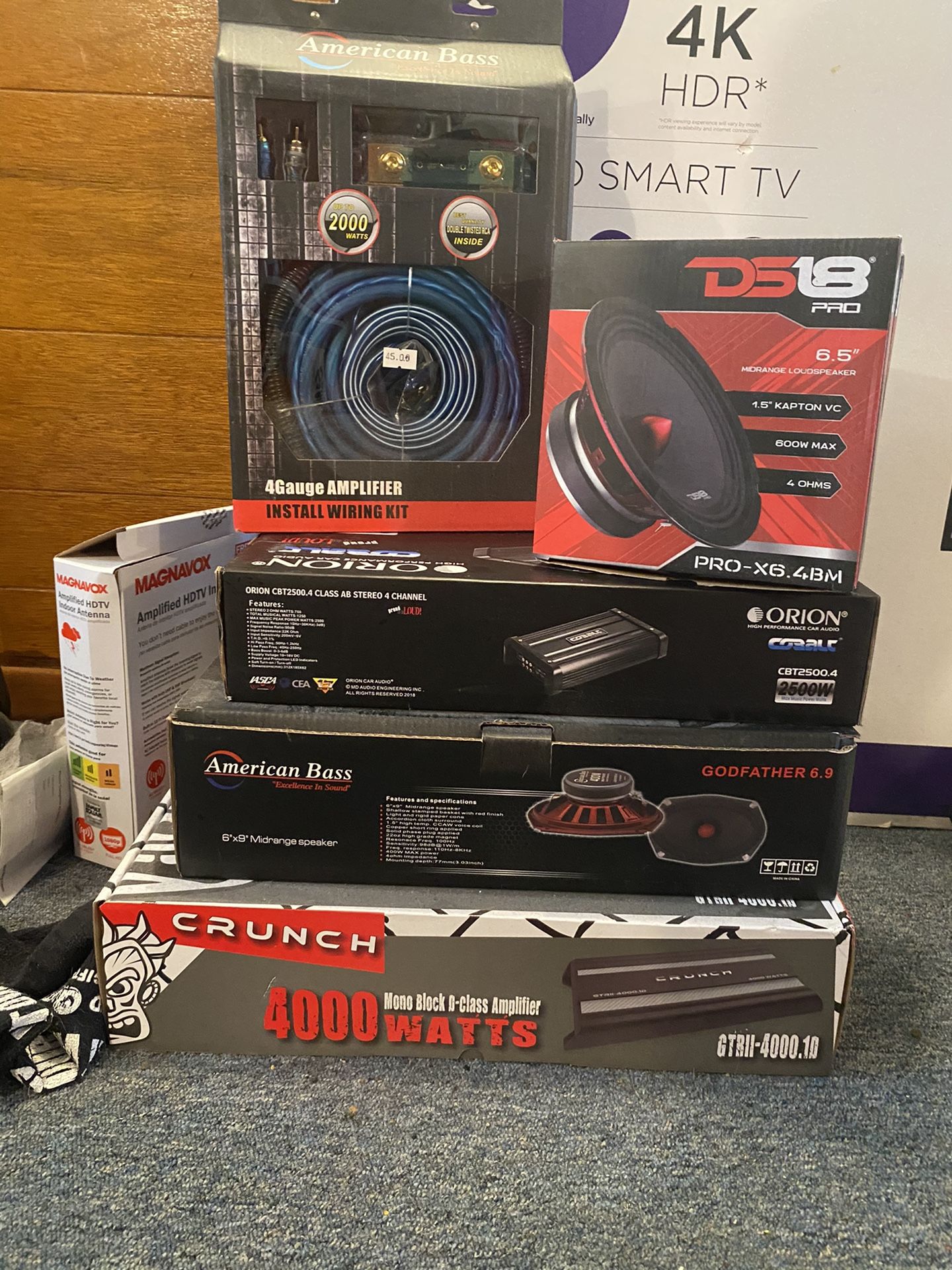 All brand new in the boxes. Will not separate, package only!! (4) amps (2)nib (6) godfathers (4)6.5 (2)6x9nib (1) American bass 15 in a custom ported box and thick gauge wiring kit $750obo