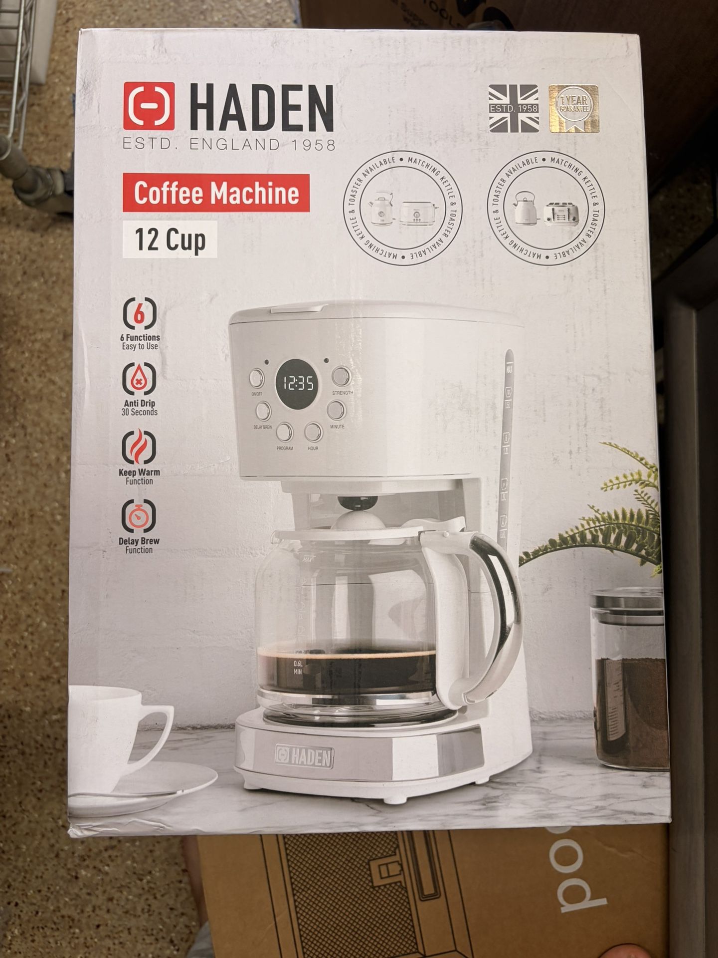 Haden 12-Cup Programmable Coffee Maker in ivory white, featuring a vintage retro aesthetic